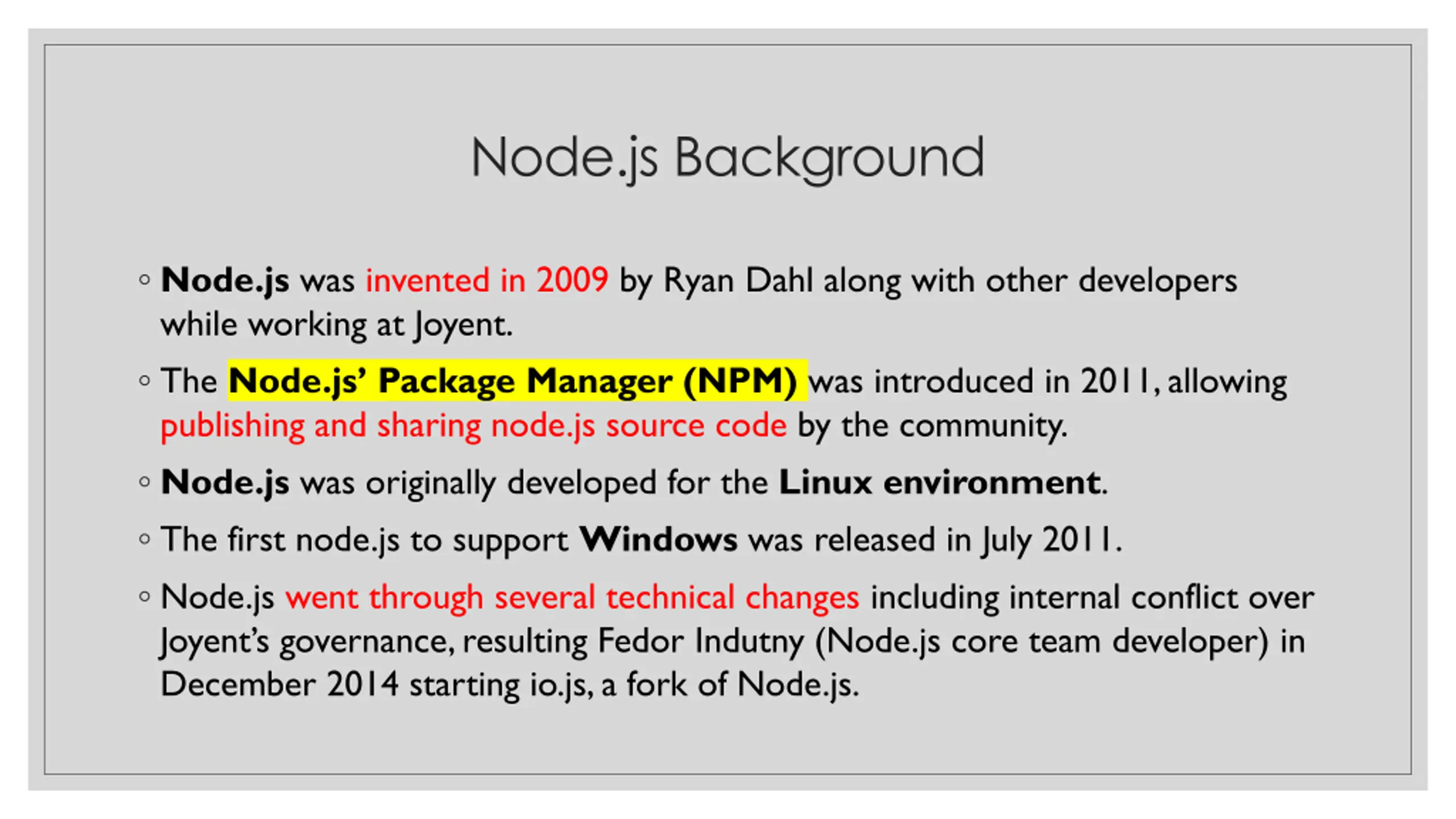 Node.js Background Node.js was invented in 2009 by Ryan Dahl along with other developers while working at Joyent. The Node.js Package Manager (NPM) was introduced in 2011, allowing publishing and sharing node.js source code by the community. Node.js was originally developed for the Linux environment. The first node.js to support Windows was released in July 2011. Node.js went through several technical changes including internal conflict over Joyent s governance, resulting Fedor Indutny (Node.js core team developer) in December 2014 starting io.js, a fork of Node.js.