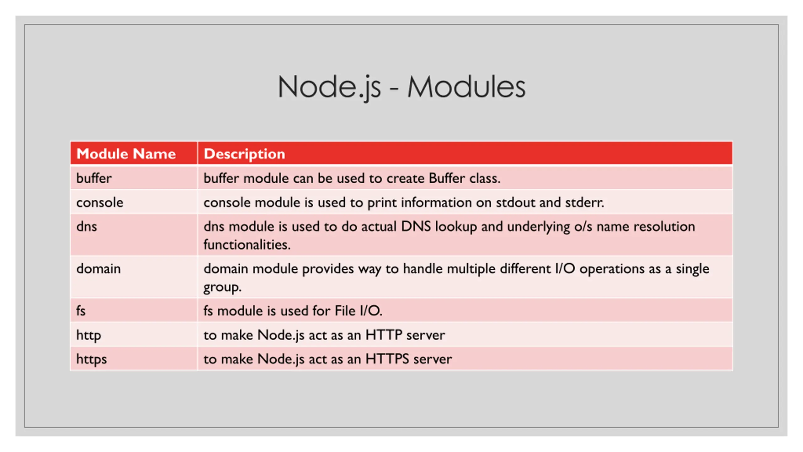 Node.js - Modules Module Name buffer console dns Description buffer module can be used to create Buffer class. console module is used to print information on stdout and stderr. dns module is used to do actual DNS lookup and underlying o/s name resolution functionalities. domain module provides way to handle multiple different I/O operations as a single group. fs module is used for File I/O. to make Node.js act as an HTTP server to make Node.js act as an HTTPS server domain fs http https