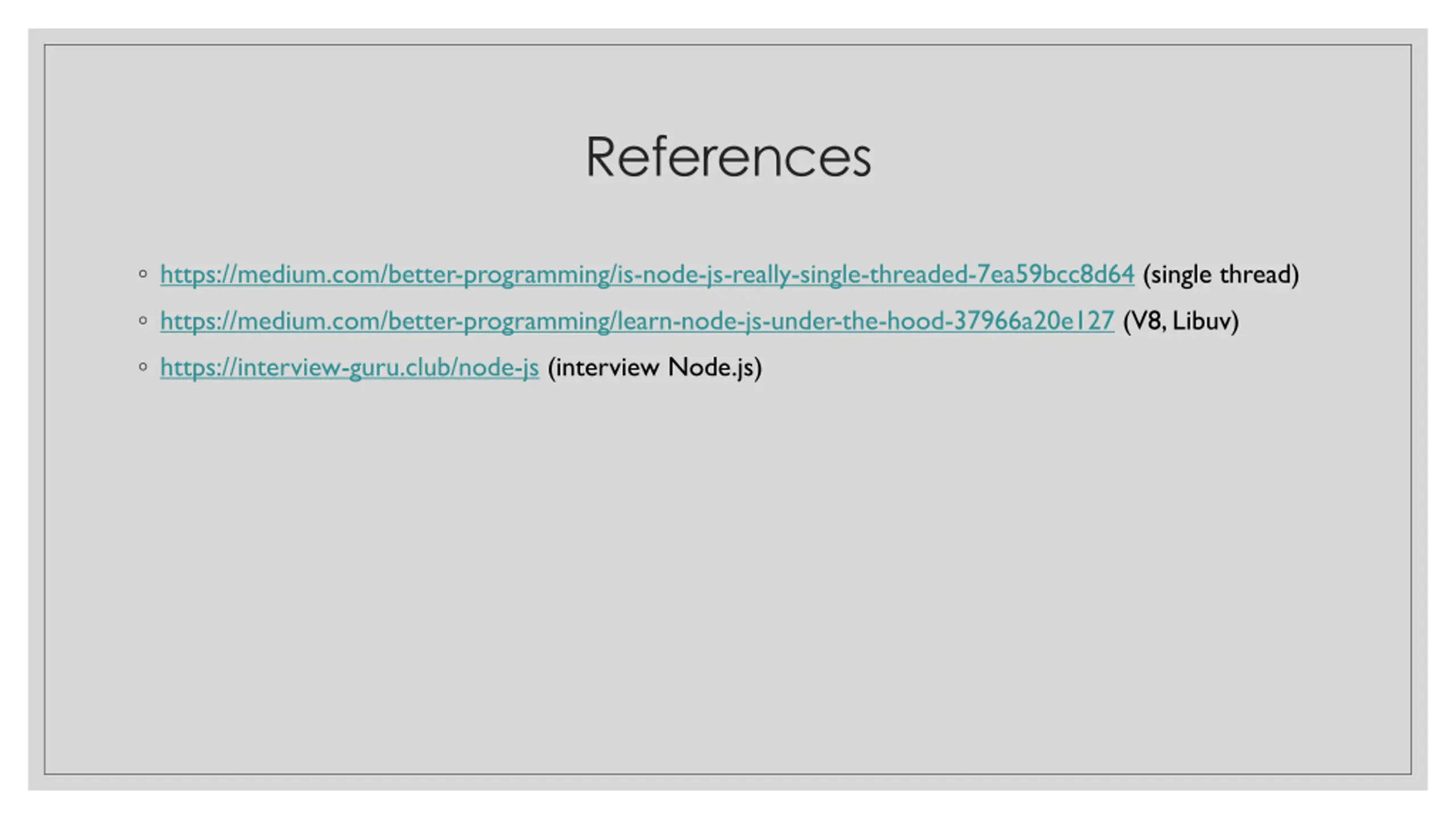 References https://medium.com/better-programming/is-node-js-really-single-threaded-7ea59bcc8d64 (single thread) https://medium.com/better-programming/learn-node-js-under-the-hood-37966a20e127 (V8, Libuv) https://interview-guru.club/node-js (interview Node.js)