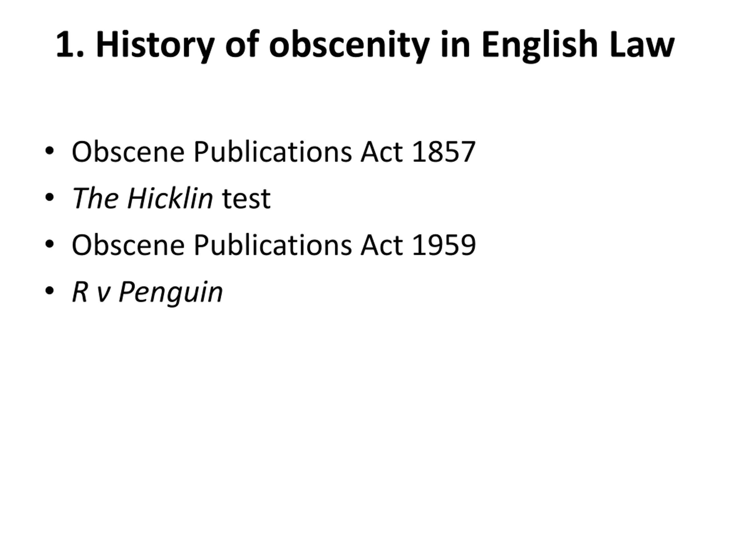 1. History of obscenity in English Law Obscene Publications Act 1857 The Hicklin test Obscene Publications Act 1959 R v Penguin