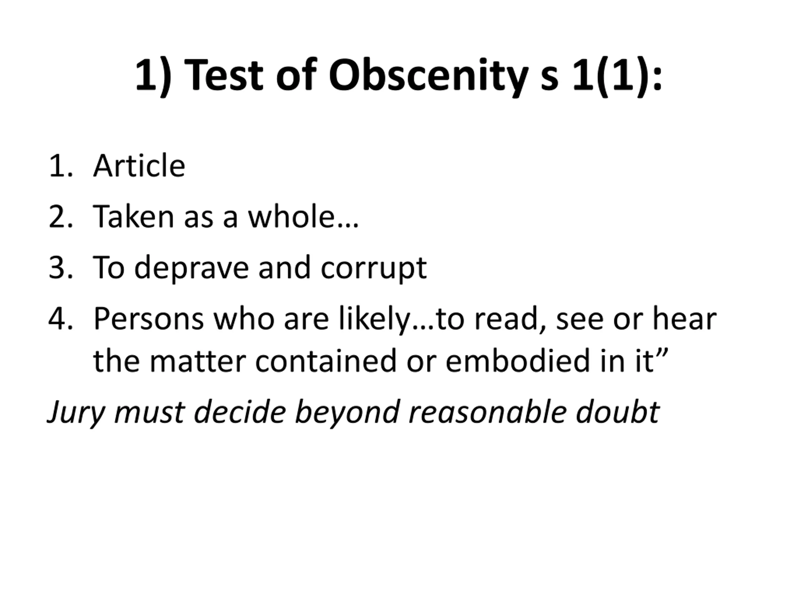 1) Test of Obscenity s 1(1): 1. Article 2. Taken as a whole 3. To deprave and corrupt 4. Persons who are likely to read, see or hear the matter contained or embodied in it Jury must decide beyond reasonable doubt