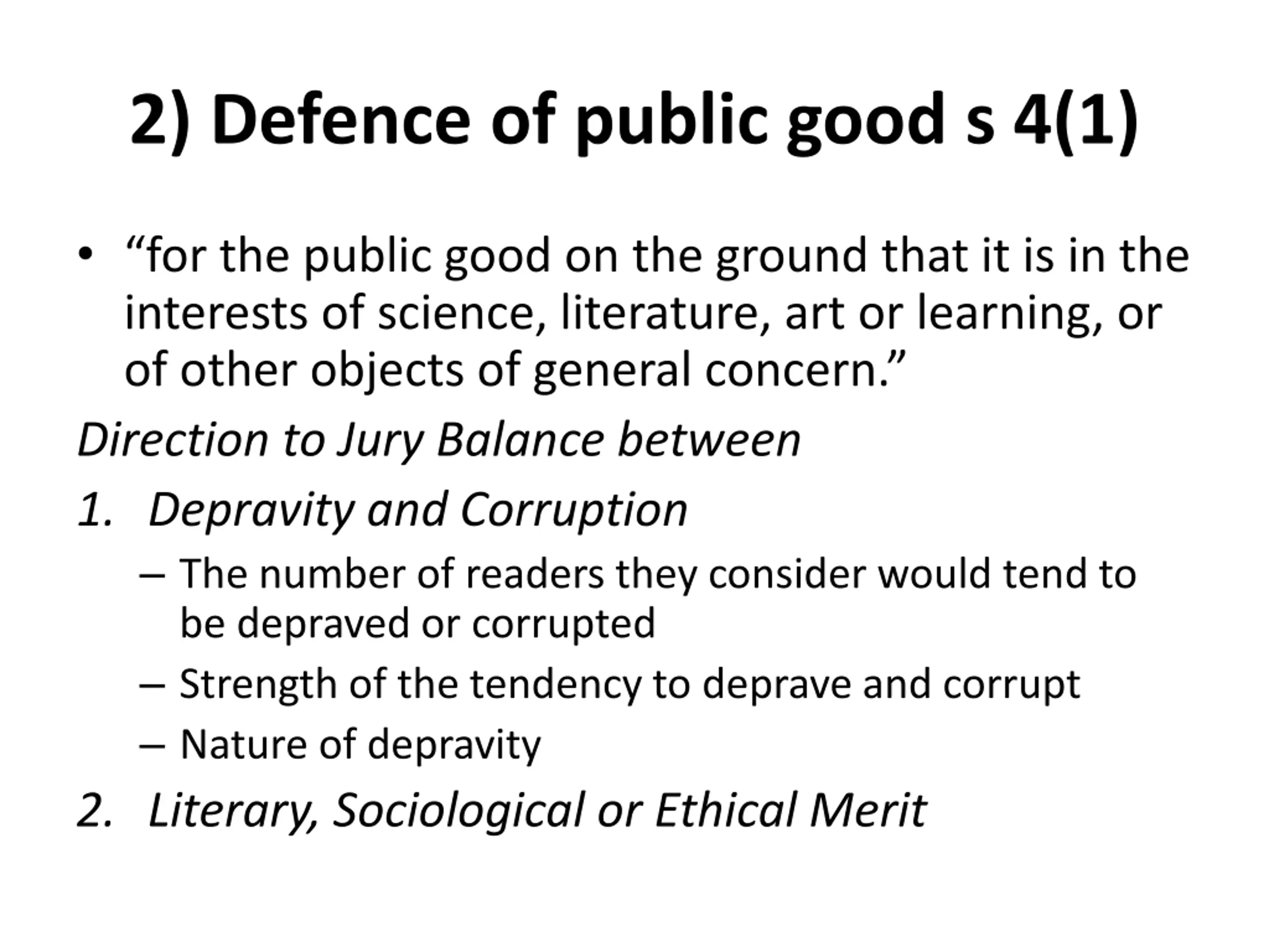 2) Defence of public good s 4(1) for the public good on the ground that it is in the interests of science, literature, art or learning, or of other objects of general concern. Direction to Jury Balance between 1. Depravity and Corruption The number of readers they consider would tend to be depraved or corrupted Strength of the tendency to deprave and corrupt Nature of depravity 2. Literary, Sociological or Ethical Merit