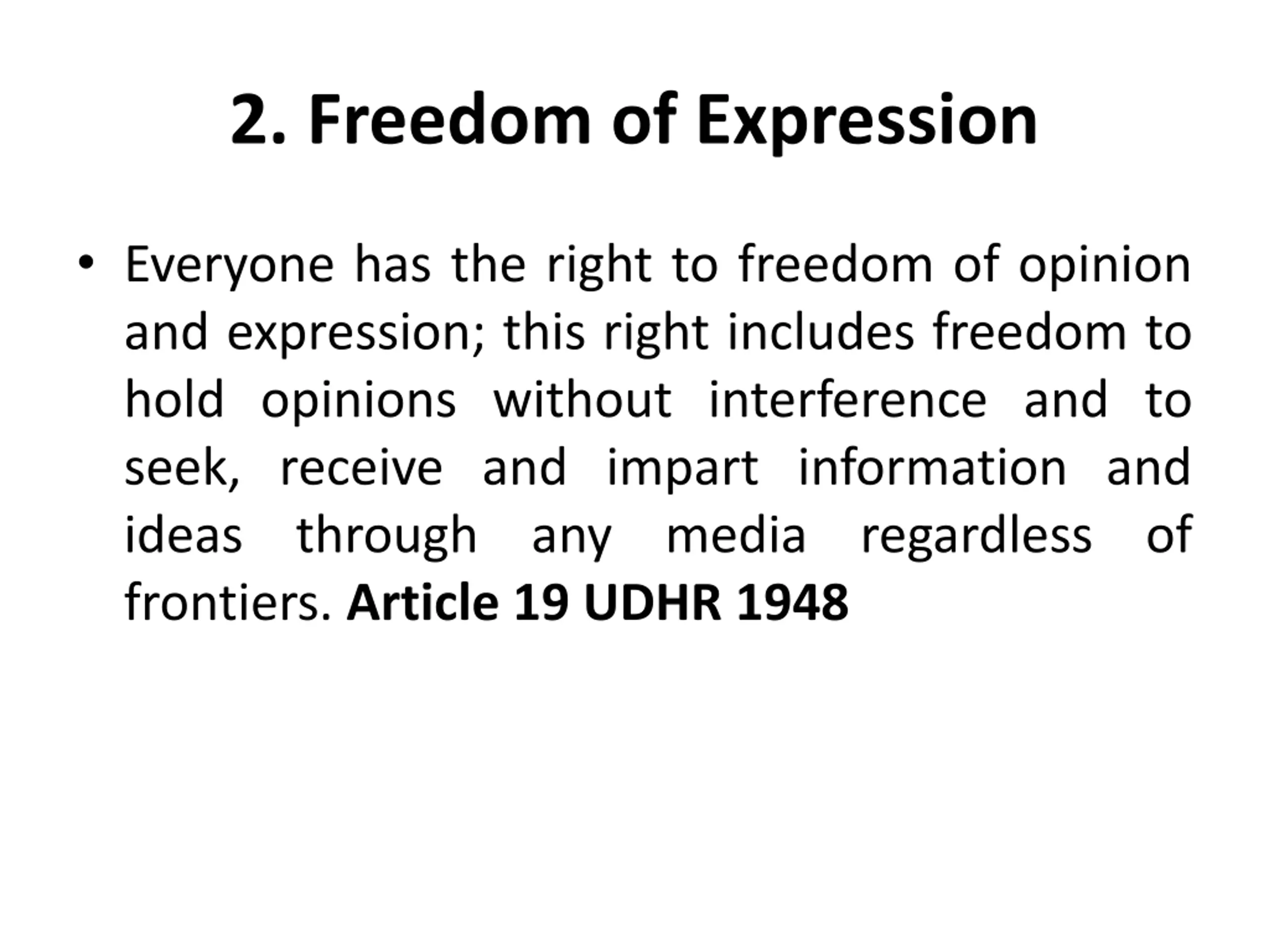 2. Freedom of Expression Everyone has the right to freedom of opinion and expression; this right includes freedom to hold opinions without interference and to seek, receive and impart information and ideas through any frontiers. Article 19 UDHR 1948 media regardless of