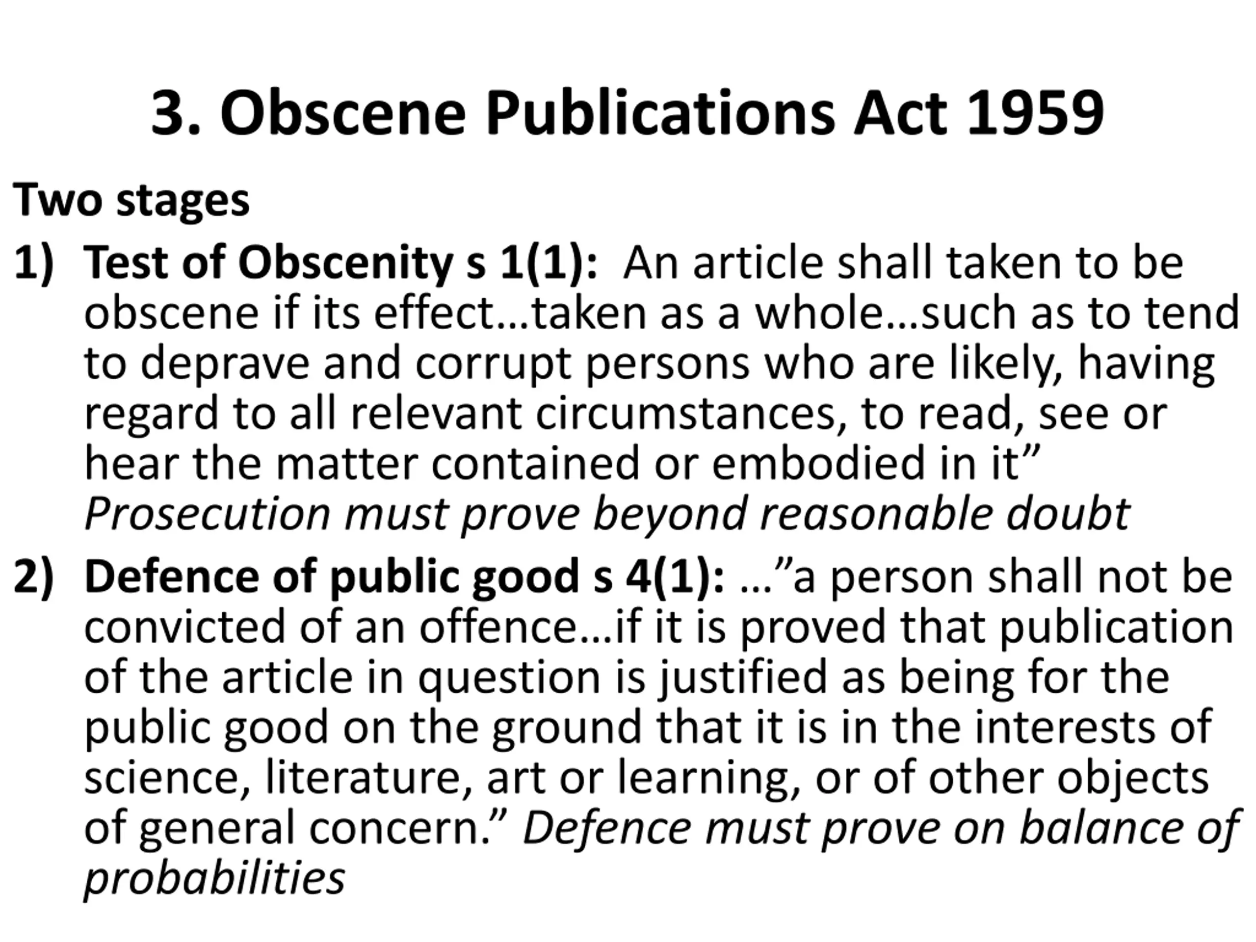 3. Obscene Publications Act 1959 Two stages 1) Test of Obscenity s 1(1): An article shall taken to be obscene if its effect taken as a whole such as to tend to deprave and corrupt persons who are likely, having regard to all relevant circumstances, to read, see or hear the matter contained or embodied in it Prosecution must prove beyond reasonable doubt 2) Defence of public good s 4(1): a person shall not be convicted of an offence if it is proved that publication of the article in question is justified as being for the public good on the ground that it is in the interests of science, literature, art or learning, or of other objects of general concern. Defence must prove on balance of probabilities