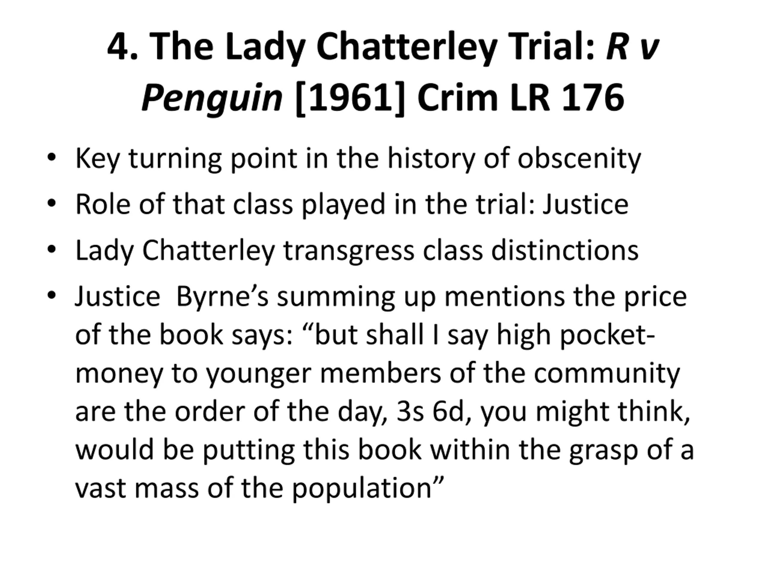 4. The Lady Chatterley Trial: R v Penguin [1961] Crim LR 176 Key turning point in the history of obscenity Role of that class played in the trial: Justice Lady Chatterley transgress class distinctions Justice Byrne s summing up mentions the price of the book says: but shall I say high pocket- money to younger members of the community are the order of the day, 3s 6d, you might think, would be putting this book within the grasp of a vast mass of the population