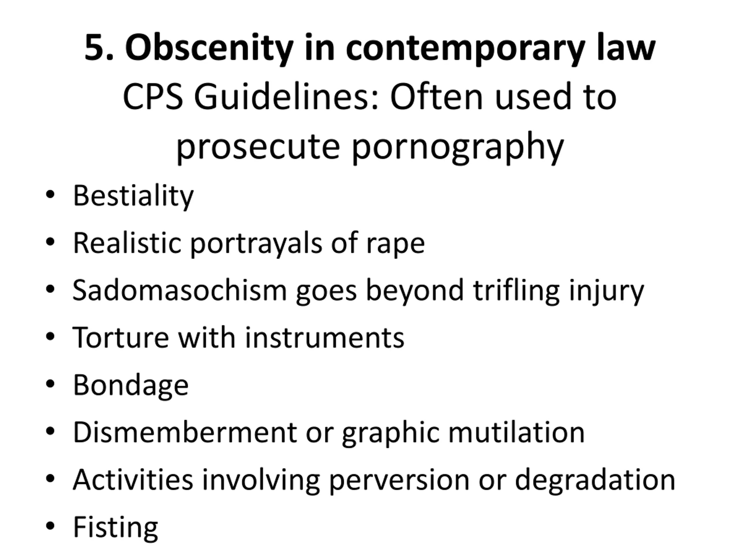 5. Obscenity in contemporary law CPS Guidelines: Often used to prosecute pornography Bestiality Realistic portrayals of rape Sadomasochism goes beyond trifling injury Torture with instruments Bondage Dismemberment or graphic mutilation Activities involving perversion or degradation Fisting