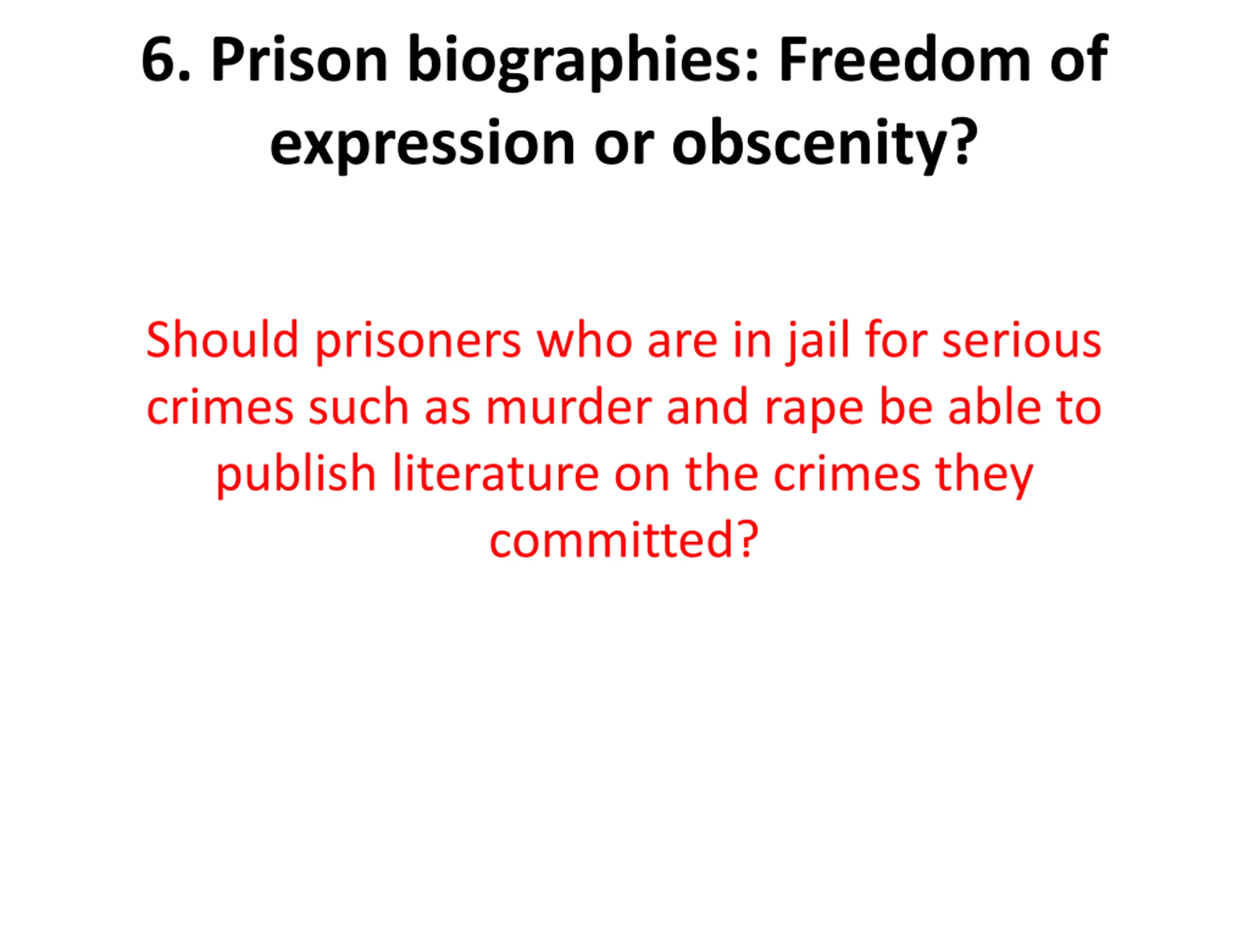 6. Prison biographies: Freedom of expression or obscenity? Should prisoners who are in jail for serious crimes such as murder and rape be able to publish literature on the crimes they committed?
