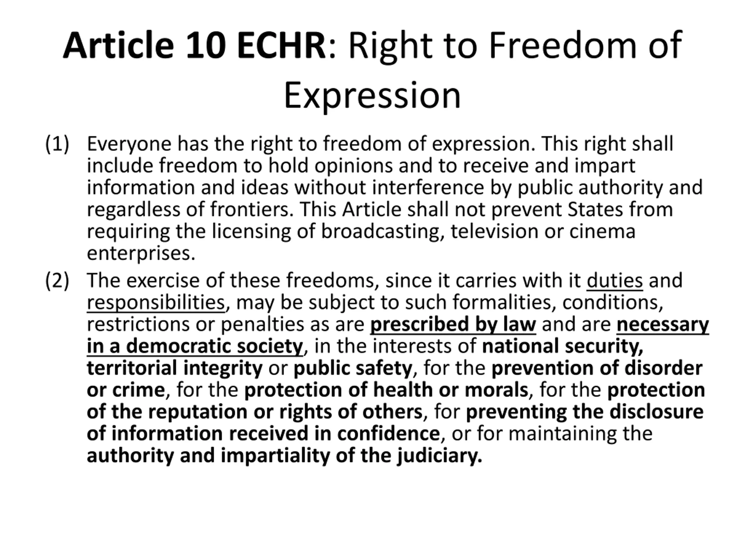 Article 10 ECHR: Right to Freedom of Expression (1) Everyone has the right to freedom of expression. This right shall include freedom to hold opinions and to receive and impart information and ideas without interference by public authority and regardless of frontiers. This Article shall not prevent States from requiring the licensing of broadcasting, television or cinema enterprises. (2) The exercise of these freedoms, since it carries with it duties and responsibilities, may be subject to such formalities, conditions, restrictions or penalties as are prescribed by law and are necessary in a democratic society, in the interests of national security, territorial integrity or public safety, for the prevention of disorder or crime, for the protection of health or morals, for the protection of the reputation or rights of others, for preventing the disclosure of information received in confidence, or for maintaining the authority and impartiality of the judiciary.