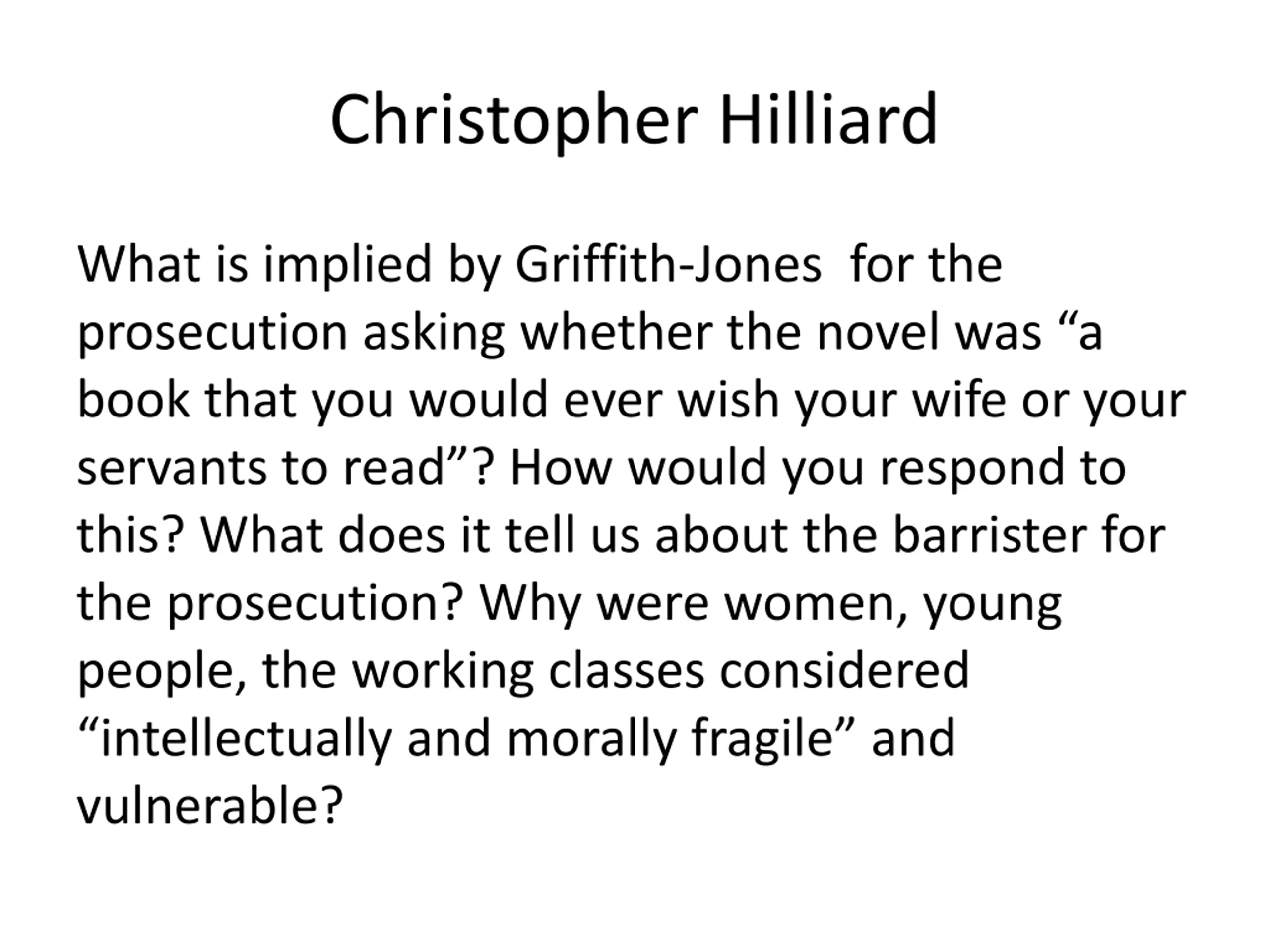 Christopher Hilliard What is implied by Griffith-Jones for the prosecution asking whether the novel was a book that you would ever wish your wife or your servants to read ? How would you respond to this? What does it tell us about the barrister for the prosecution? Why were women, young people, the working classes considered intellectually and morally fragile and vulnerable?