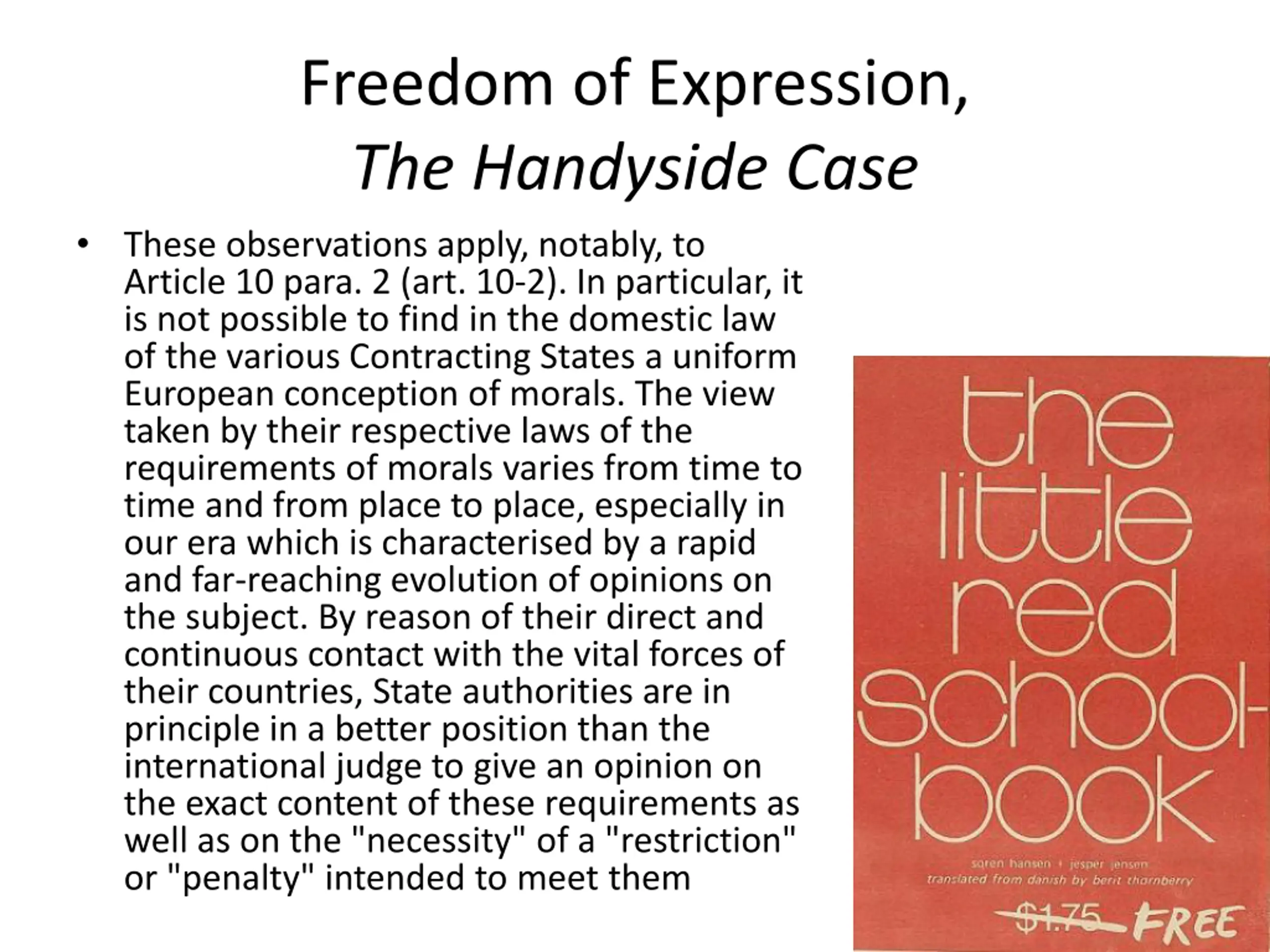 Freedom of Expression, The Handyside Case These observations apply, notably, to Article 10 para. 2 (art. 10-2). In particular, it is not possible to find in the domestic law of the various Contracting States a uniform European conception of morals. The view taken by their respective laws of the requirements of morals varies from time to time and from place to place, especially in our era which is characterised by a rapid and far-reaching evolution of opinions on the subject. By reason of their direct and continuous contact with the vital forces of their countries, State authorities are in principle in a better position than the international judge to give an opinion on the exact content of these requirements as well as on the "necessity" of a "restriction" or "penalty" intended to meet them