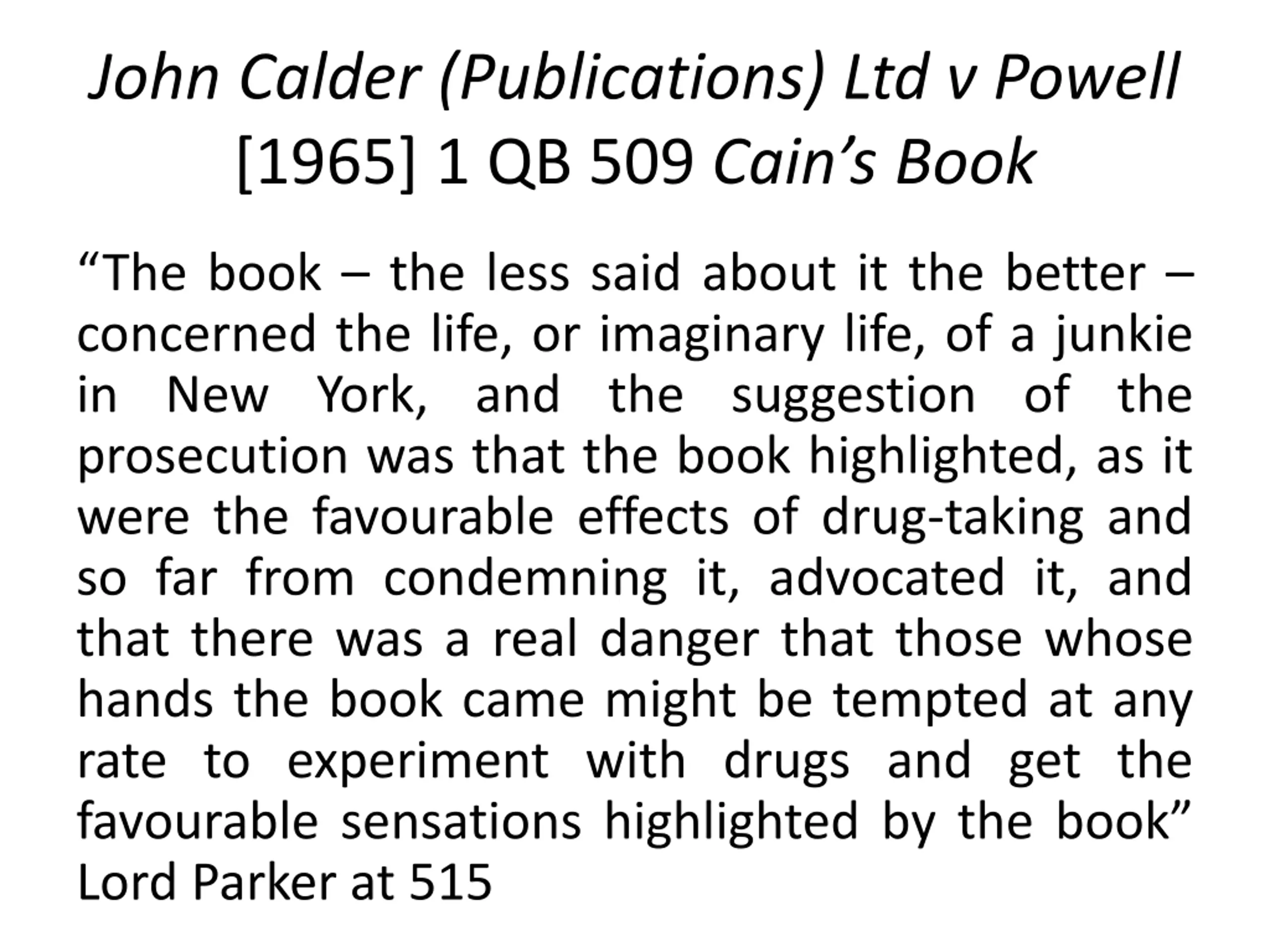 John Calder (Publications) Ltd v Powell [1965] 1 QB 509 Cain s Book The book the less said about it the better concerned the life, or imaginary life, of a junkie in New York, and the suggestion of the prosecution was that the book highlighted, as it were the favourable effects of drug-taking and so far from condemning it, advocated it, and that there was a real danger that those whose hands the book came might be tempted at any rate to experiment with drugs and get the favourable sensations highlighted by the book Lord Parker at 515