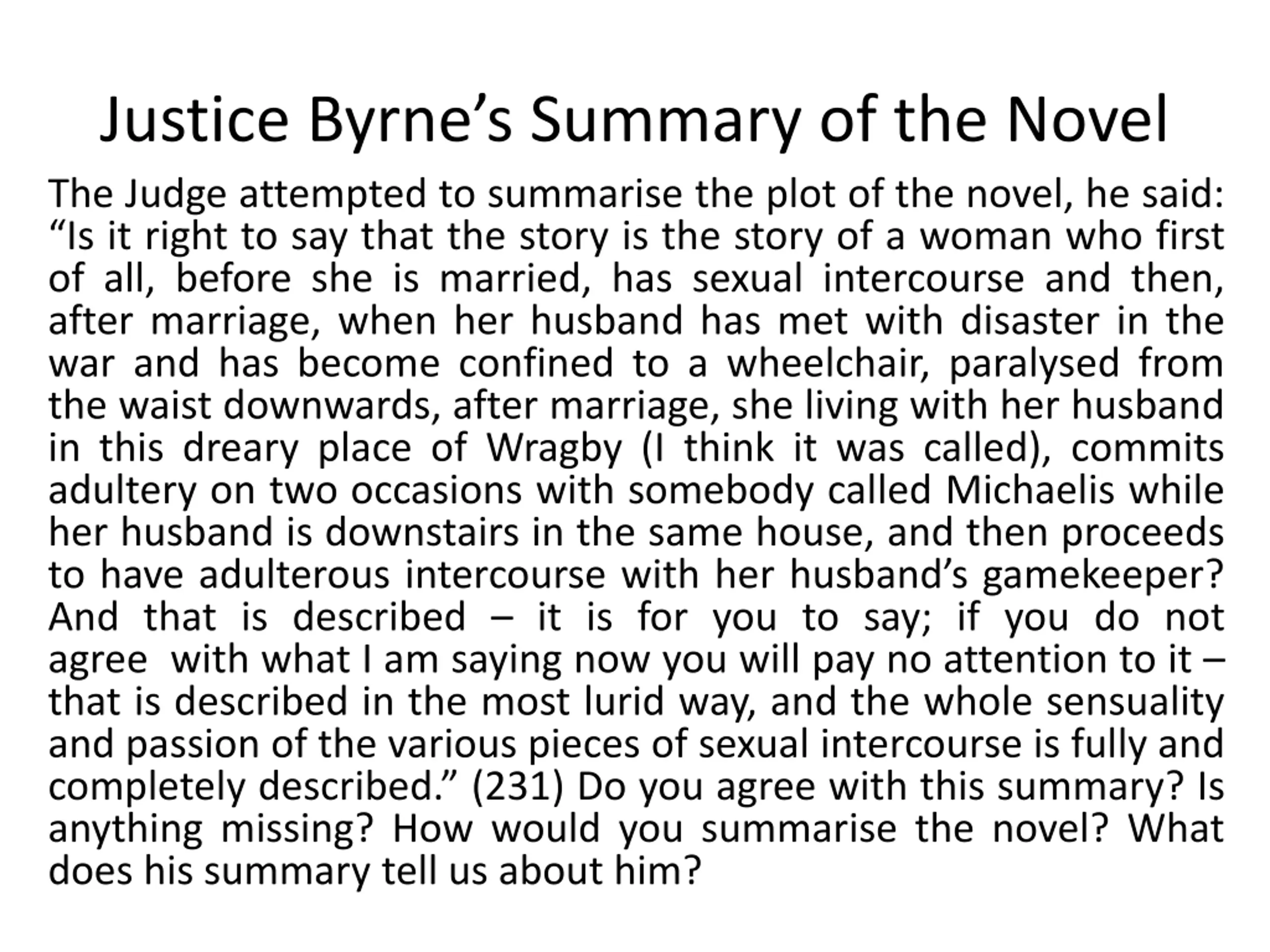 Justice Byrnes Summary of the Novel The Judge attempted to summarise the plot of the novel, he said: Is it right to say that the story is the story of a woman who first of all, before she is married, has sexual intercourse and then, after marriage, when her husband has met with disaster in the war and has become confined to a wheelchair, paralysed from the waist downwards, after marriage, she living with her husband in this dreary place of Wragby (I think it was called), commits adultery on two occasions with somebody called Michaelis while her husband is downstairs in the same house, and then proceeds to have adulterous intercourse with her husband s gamekeeper? And that is described it is for you to say; if you do not agree with what I am saying now you will pay no attention to it that is described in the most lurid way, and the whole sensuality and passion of the various pieces of sexual intercourse is fully and completely described. (231) Do you agree with this summary? Is anything missing? How would you summarise the novel? What does his summary tell us about him?