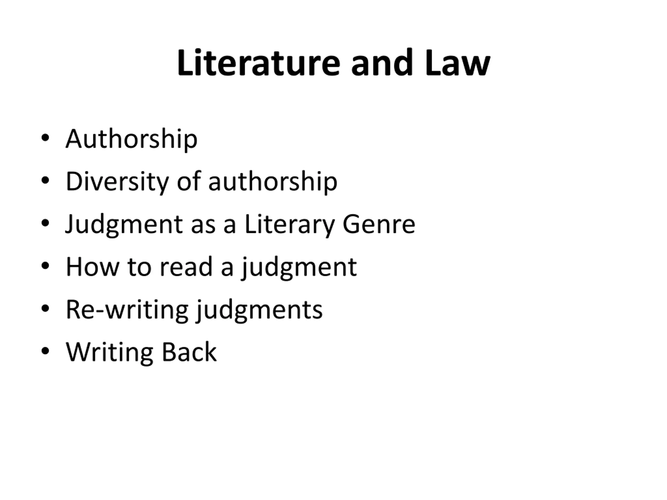 Literature and Law Authorship Diversity of authorship Judgment as a Literary Genre How to read a judgment Re-writing judgments Writing Back