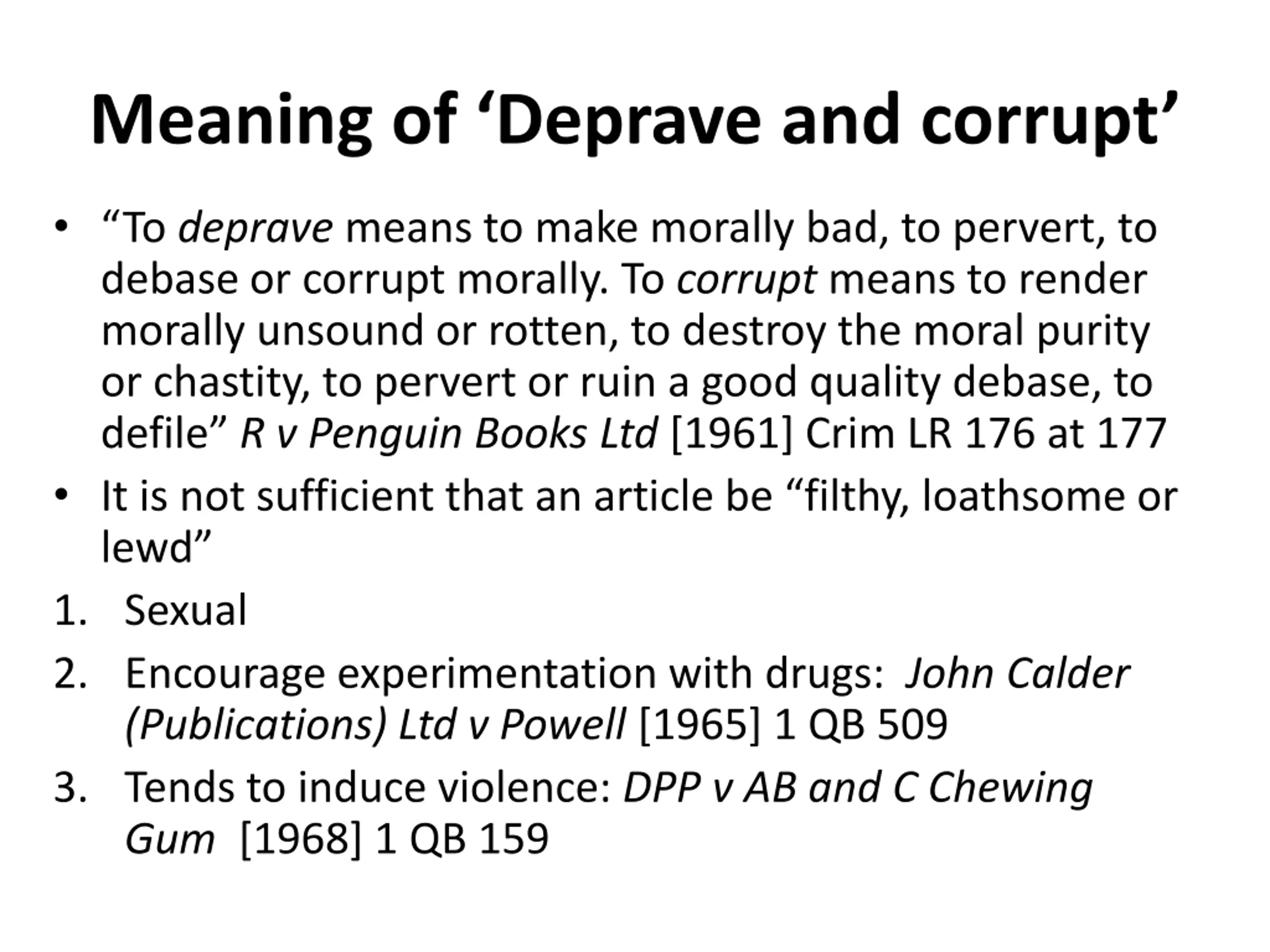 Meaning of Deprave and corrupt To deprave means to make morally bad, to pervert, to debase or corrupt morally. To corrupt means to render morally unsound or rotten, to destroy the moral purity or chastity, to pervert or ruin a good quality debase, to defile R v Penguin Books Ltd [1961] Crim LR 176 at 177 It is not sufficient that an article be filthy, loathsome or lewd 1. Sexual 2. Encourage experimentation with drugs: John Calder (Publications) Ltd v Powell [1965] 1 QB 509 3. Tends to induce violence: DPP v AB and C Chewing Gum [1968] 1 QB 159