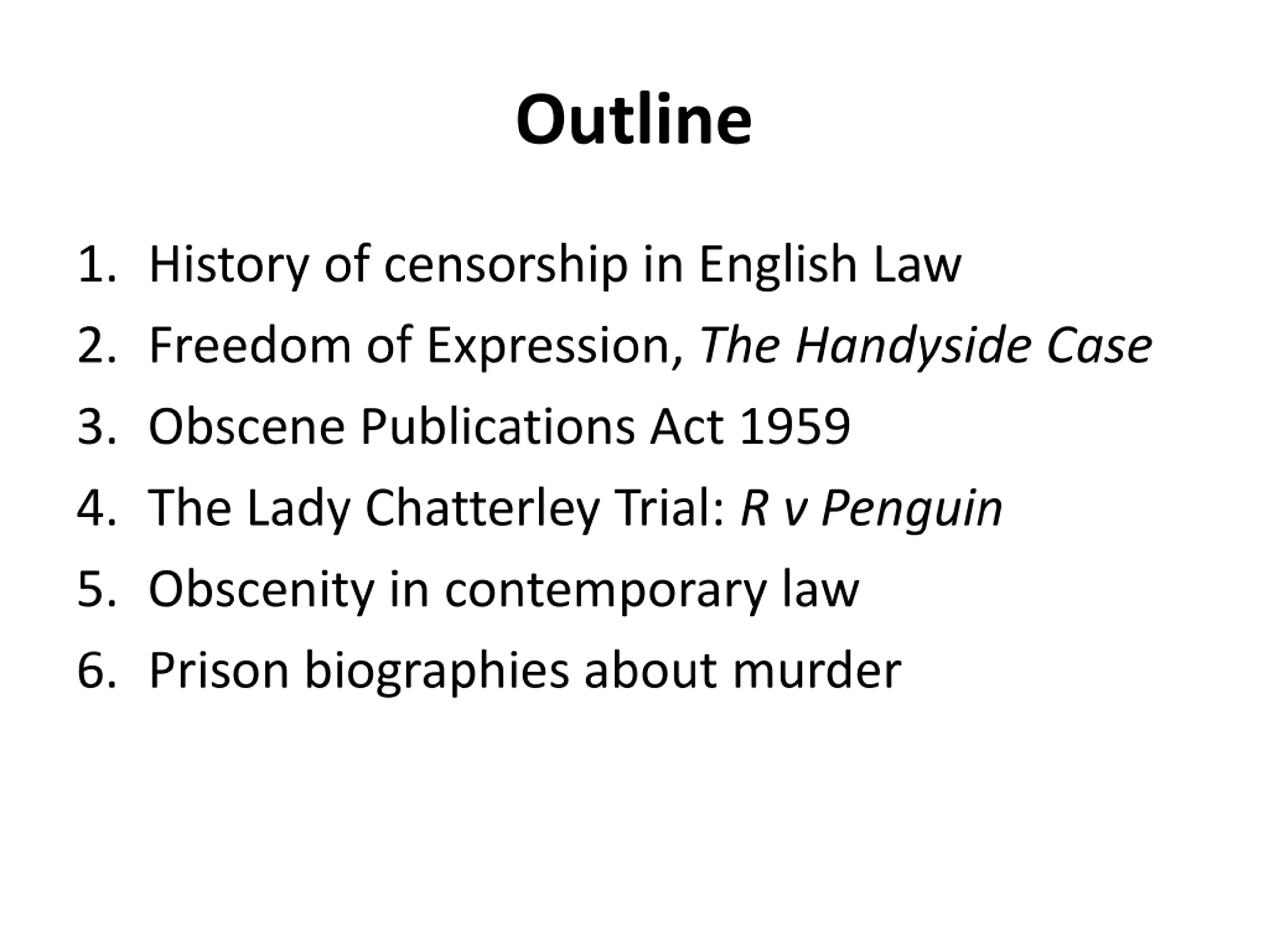 Outline 1. History of censorship in English Law 2. Freedom of Expression, The Handyside Case 3. Obscene Publications Act 1959 4. The Lady Chatterley Trial: R v Penguin 5. Obscenity in contemporary law 6. Prison biographies about murder