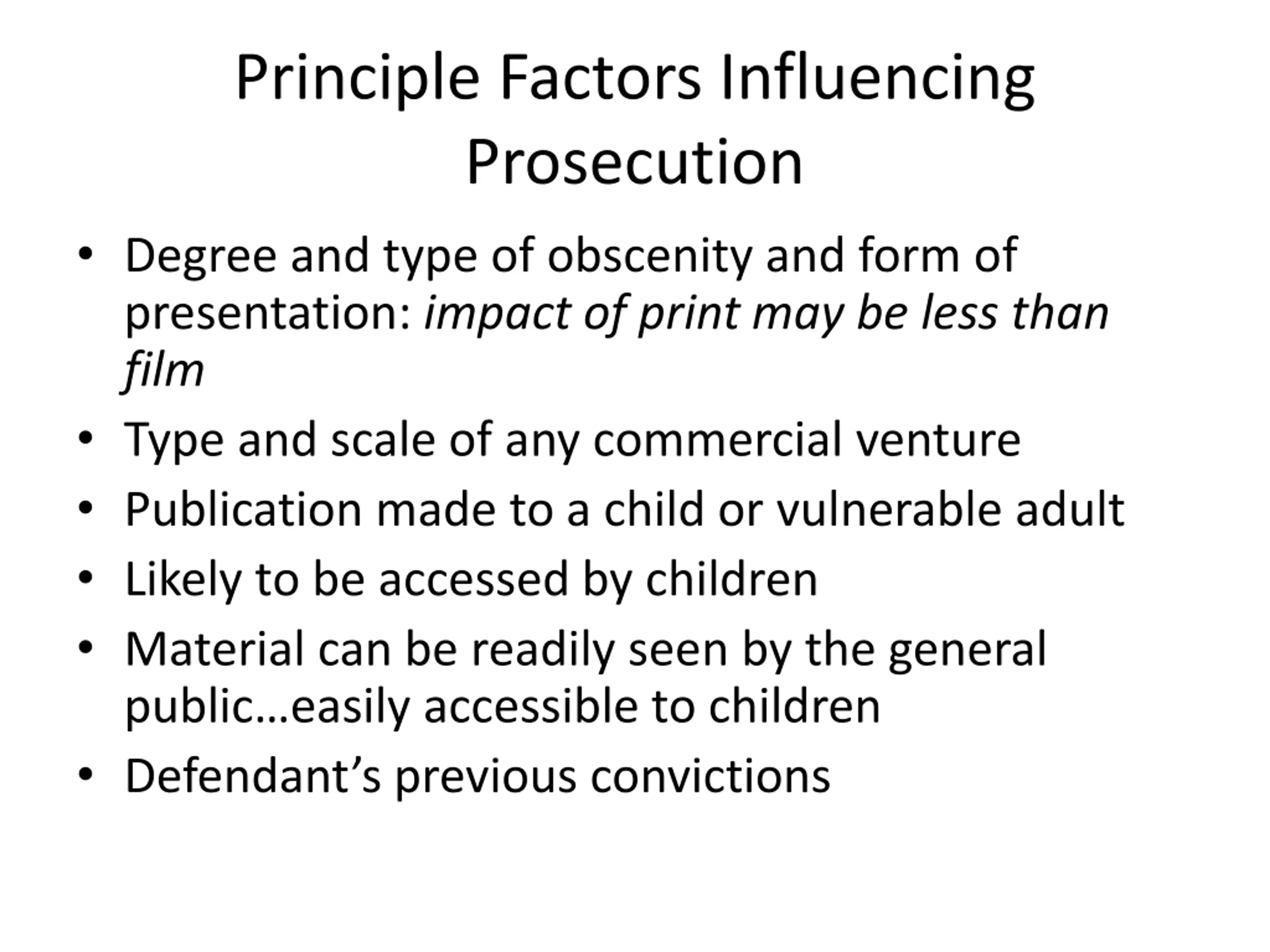 Principle Factors Influencing Prosecution Degree and type of obscenity and form of presentation: impact of print may be less than film Type and scale of any commercial venture Publication made to a child or vulnerable adult Likely to be accessed by children Material can be readily seen by the general public easily accessible to children Defendant s previous convictions