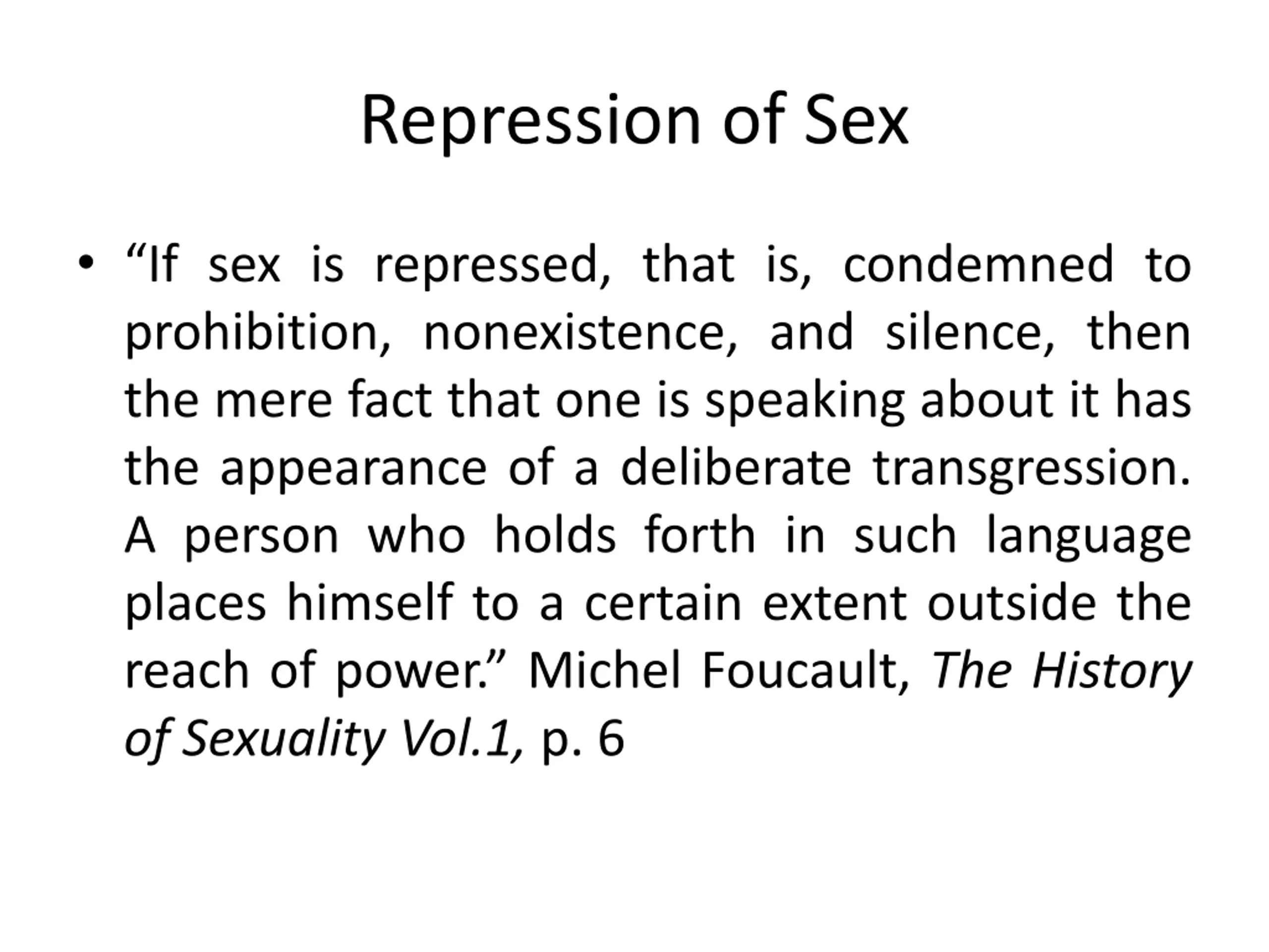 Repression of Sex If sex is repressed, that is, condemned to prohibition, nonexistence, and silence, then the mere fact that one is speaking about it has the appearance of a deliberate transgression. A person who holds forth in such language places himself to a certain extent outside the reach of power. Michel Foucault, The History of Sexuality Vol.1, p. 6