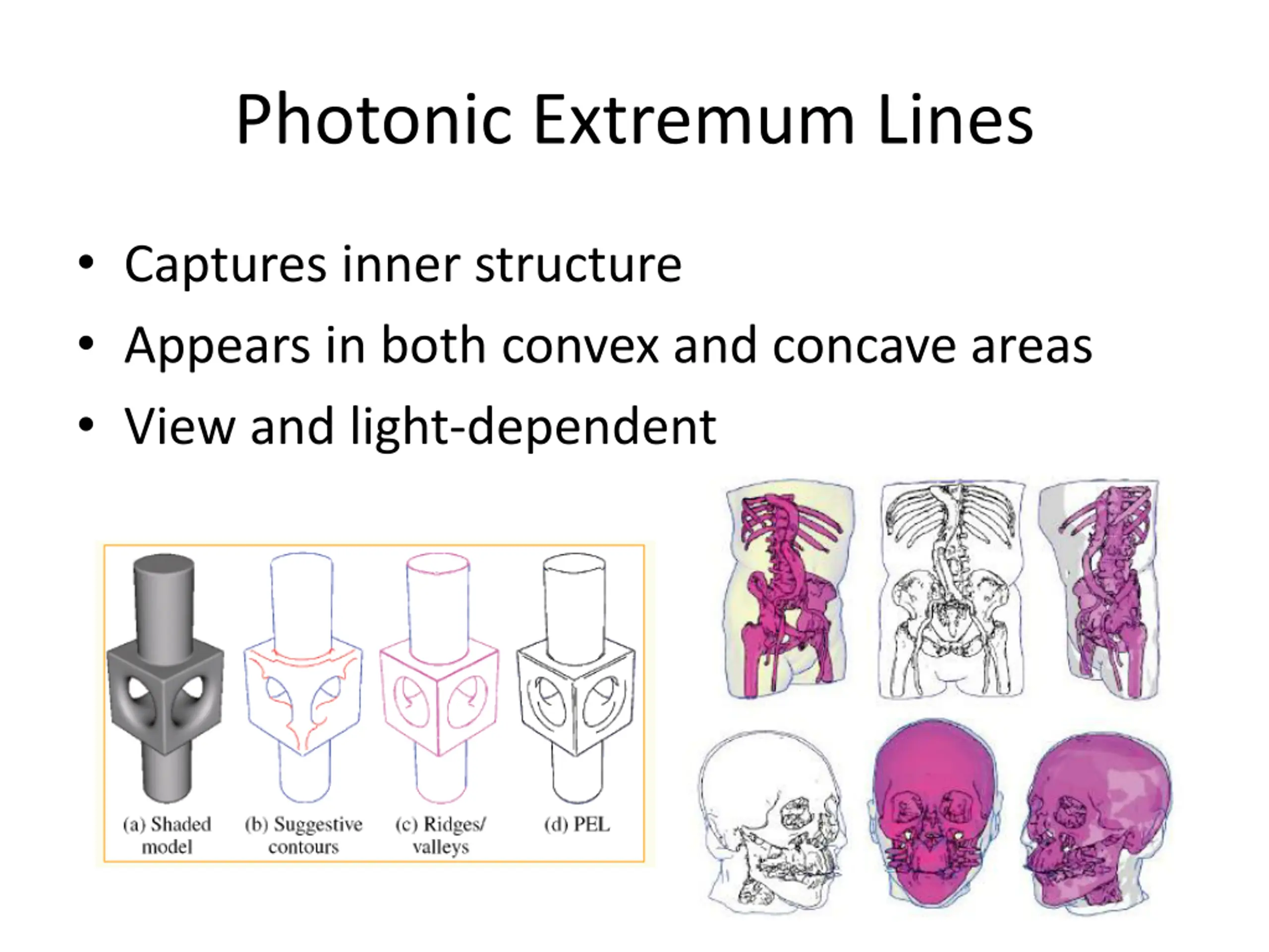 Photonic Extremum Lines (PELs) [Xie et al. IEEE TVCG 2007] In 2D image, an edge point is defined as a point at which the gradient magnitude assumes a maximum in the gradient direction. On 3D surfaces, the PEL is a set of points where the variation of illumination in the direction of its gradient reaches the local maximum.