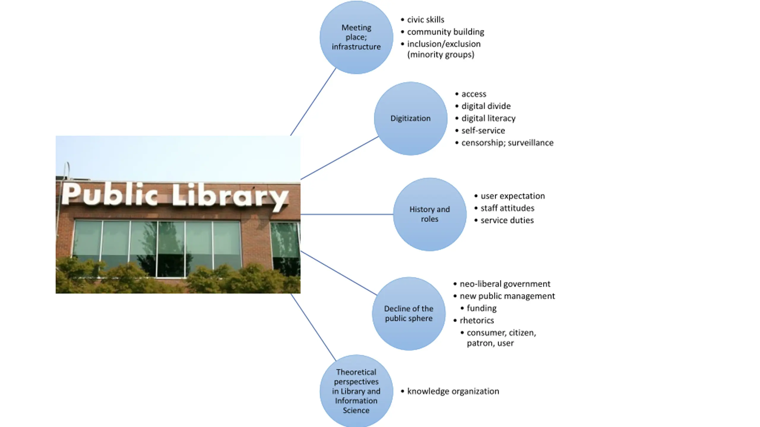 civic skills community building inclusion/exclusion (minority groups) Meeting place; infrastructure access digital divide digital literacy self-service censorship; surveillance Digitization user expectation staff attitudes service duties History and roles neo-liberal government new public management funding rhetorics consumer, citizen, patron, user Decline of the public sphere Theoretical perspectives in Library and Information Science knowledge organization
