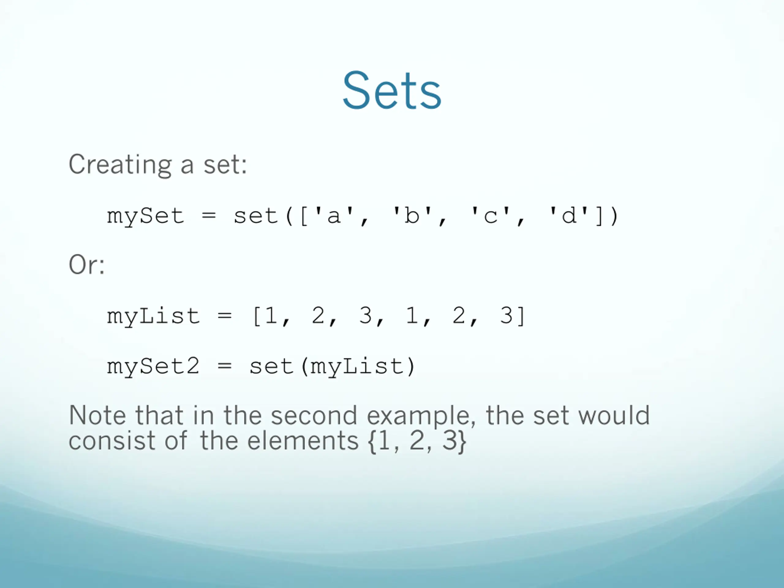 Sets Creating a set: mySet = set(['a', 'b', 'c', 'd']) Or: myList = [1, 2, 3, 1, 2, 3] mySet2 = set(myList) Note that in the second example, the set would consist of the elements {1, 2, 3}