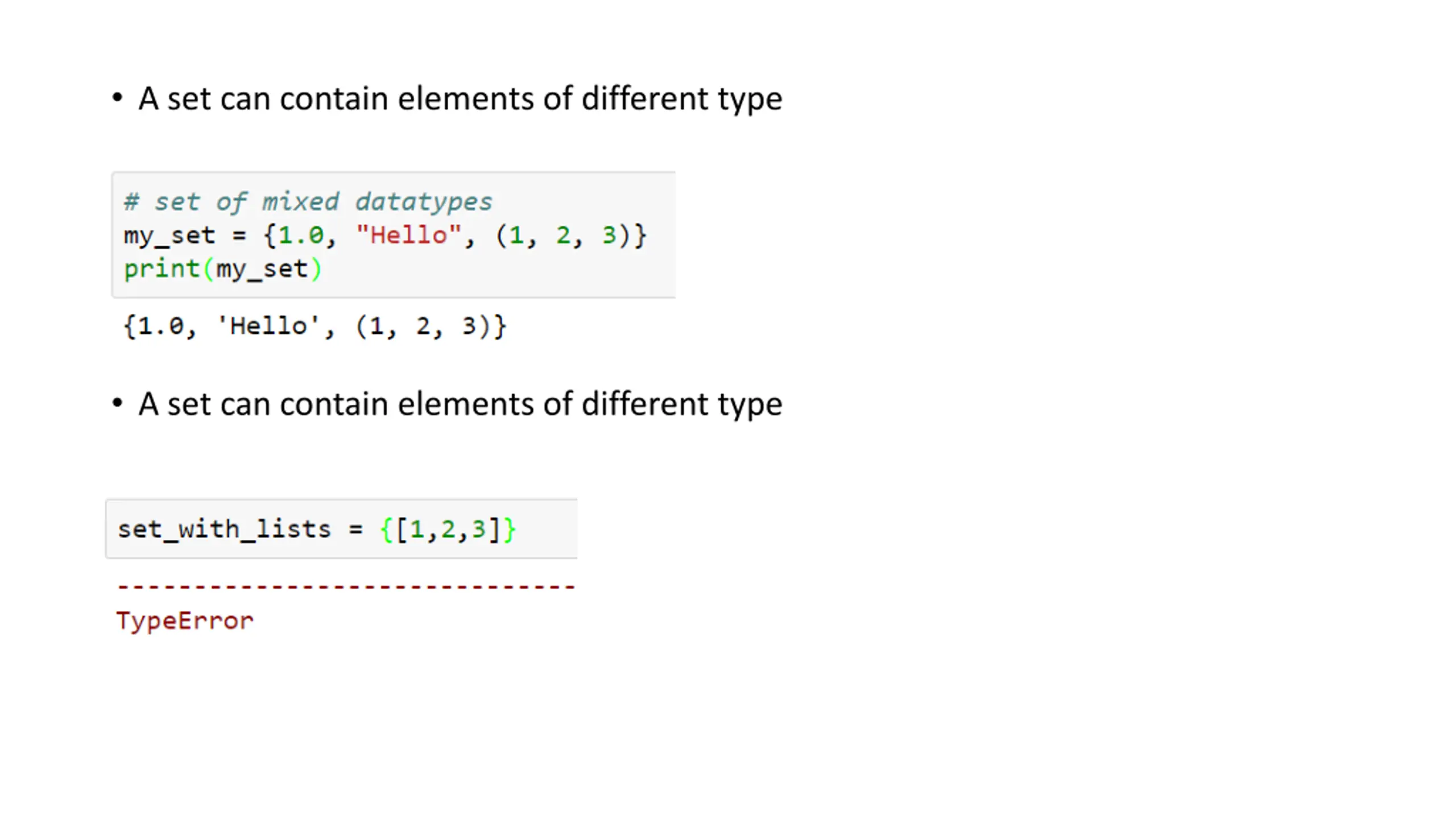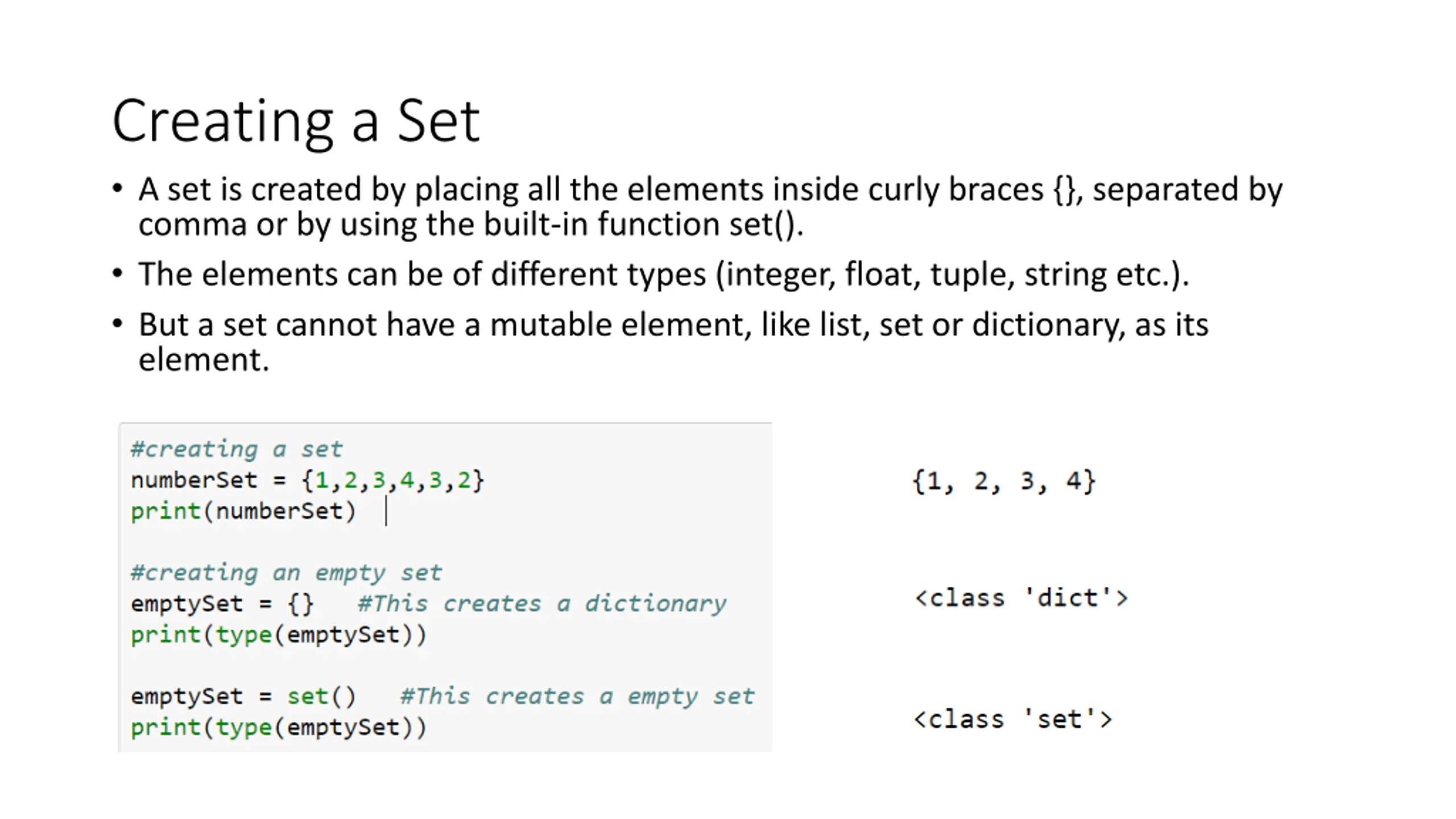 Creating a Set A set is created by placing all the elements inside curly braces {}, separated by comma or by using the built-in function set(). The elements can be of different types (integer, float, tuple, string etc.). But a set cannot have a mutable element, like list, set or dictionary, as its element.
