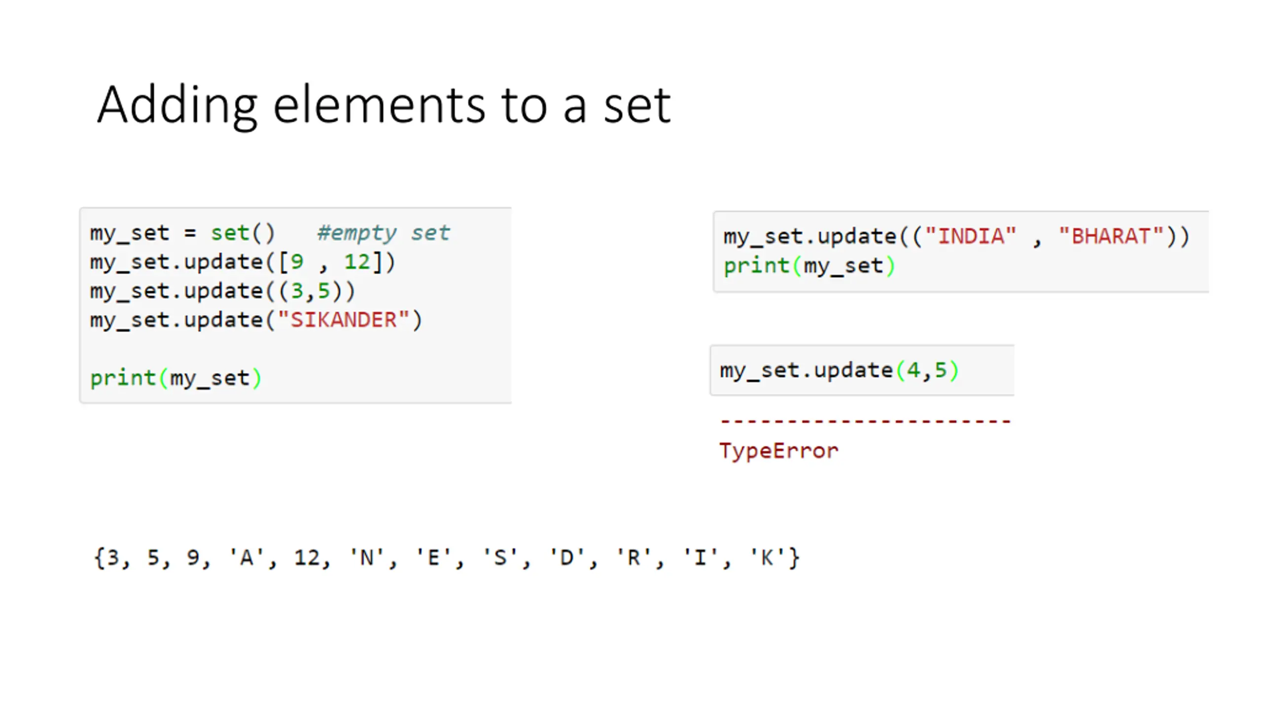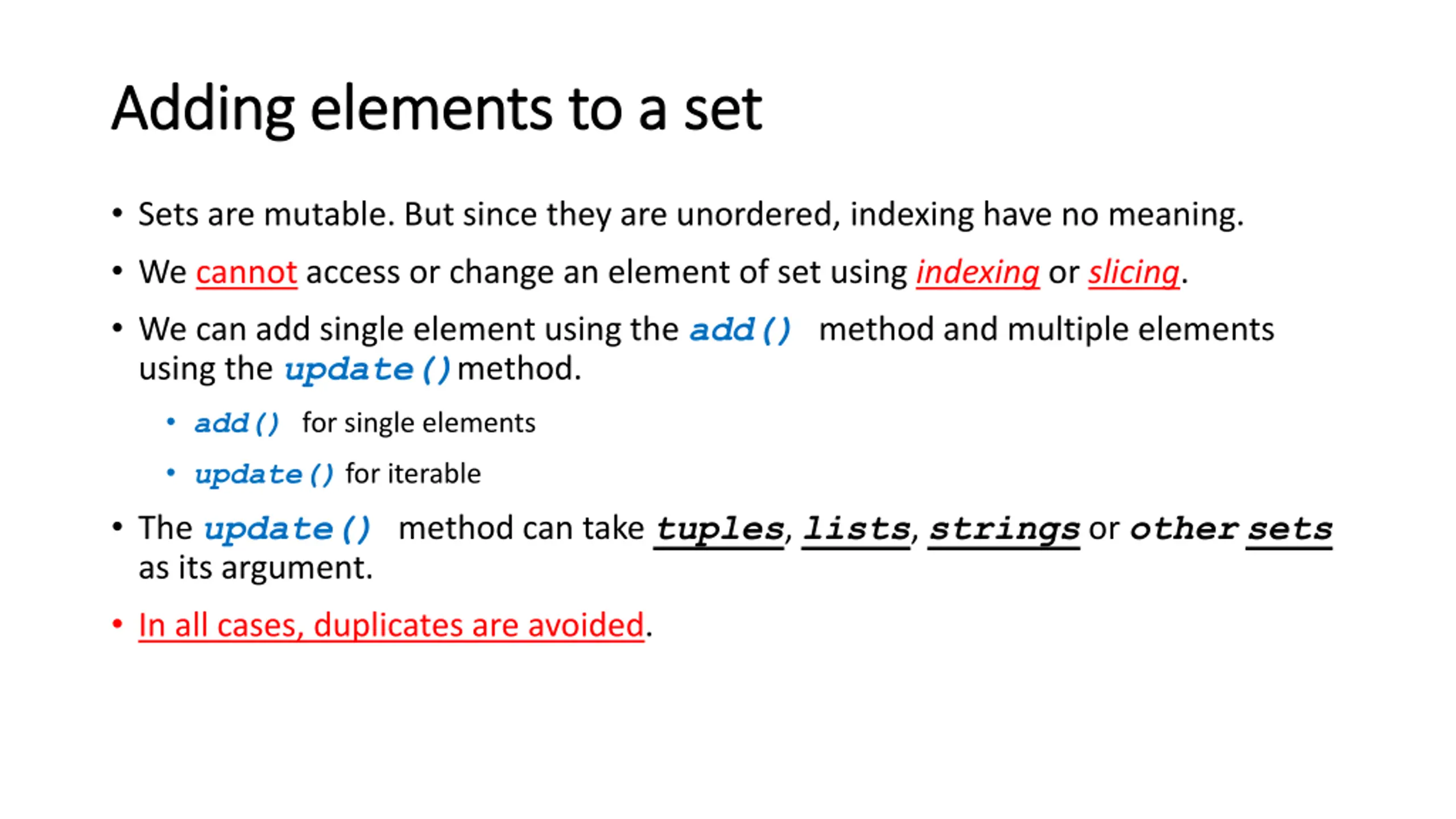 Adding elements to a set Adding elements to a set Sets are mutable. But since they are unordered, indexing have no meaning. We cannot access or change an element of set using indexing or slicing. We can add single element using the add() method and multiple elements using the update()method. add() for single elements update() for iterable The update() method can take tuples, lists, strings or othersets as its argument. In all cases, duplicates are avoided.