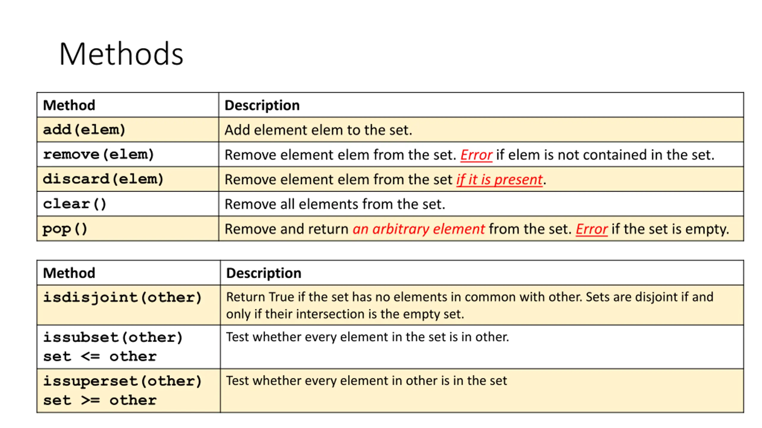 Methods Method add(elem) remove(elem) discard(elem) clear() pop() Description Add element elem to the set. Remove element elem from the set. Error if elem is not contained in the set. Remove element elem from the set if it is present. Remove all elements from the set. Remove and return an arbitrary element from the set. Error if the set is empty. Method isdisjoint(other) Description Return True if the set has no elements in common with other. Sets are disjoint if and only if their intersection is the empty set. issubset(other) set <= other issuperset(other) set >= other Test whether every element in the set is in other. Test whether every element in other is in the set