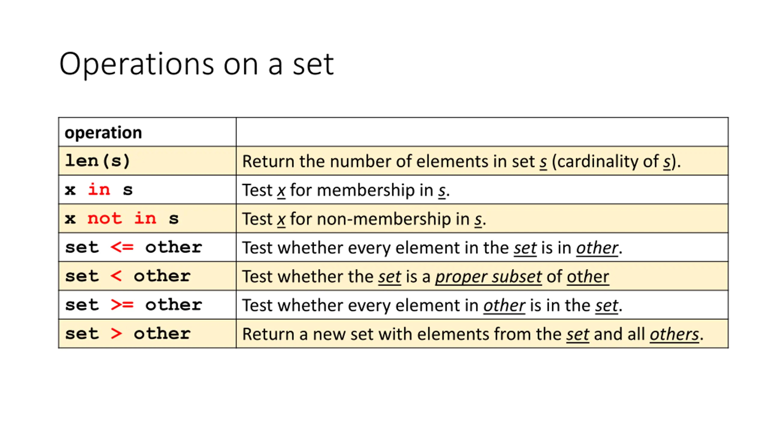 Operations on a set operation len(s) x in s x not in s set <= other set < other set >= other set > other Return the number of elements in set s (cardinality of s). Test x for membership in s. Test x for non-membership in s. Test whether every element in the set is in other. Test whether the set is a propersubset of other Test whether every element in other is in the set. Return a new set with elements from the set and all others.