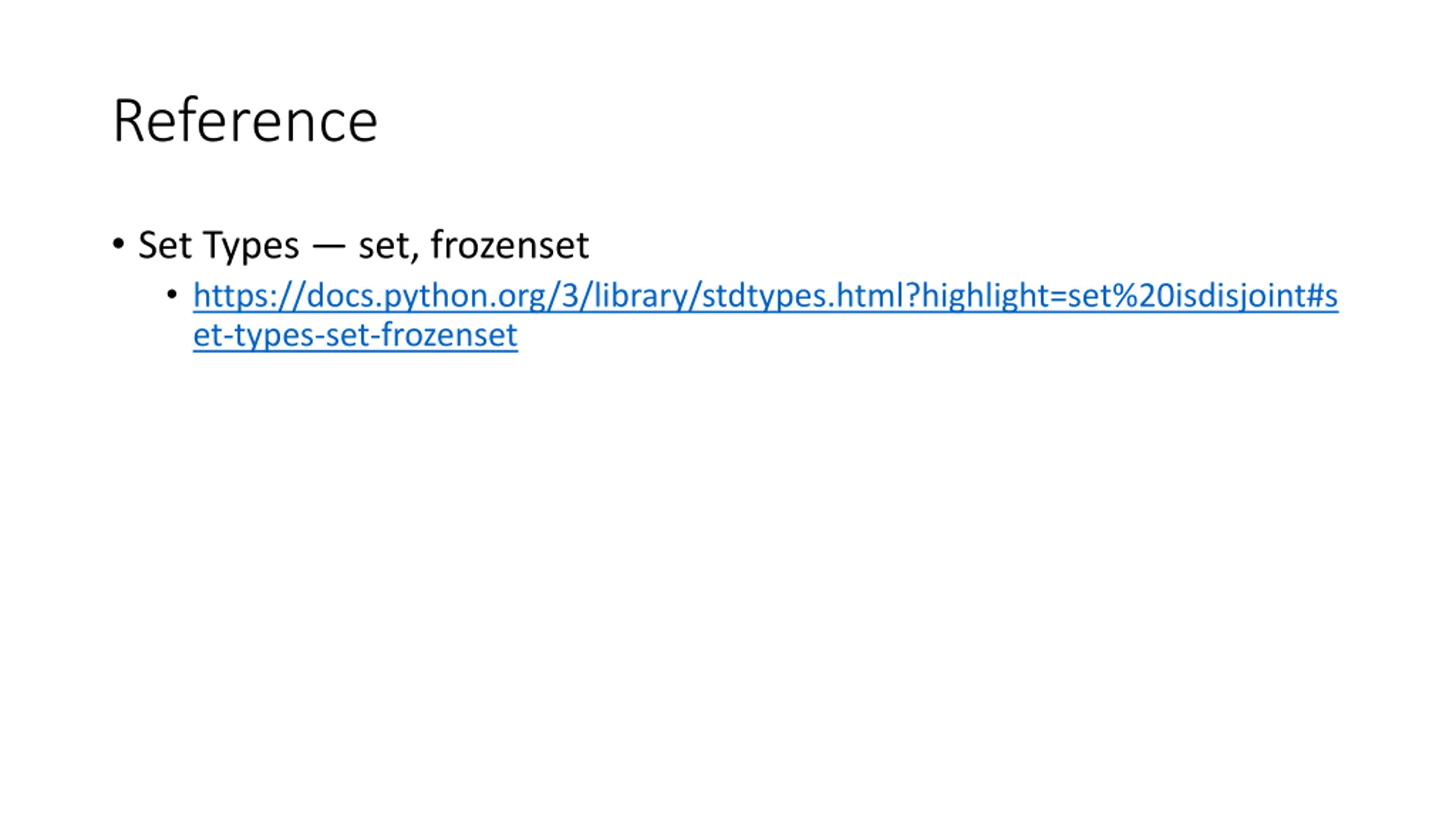Reference Set Types set, frozenset https://docs.python.org/3/library/stdtypes.html?highlight=set%20isdisjoint#s et-types-set-frozenset