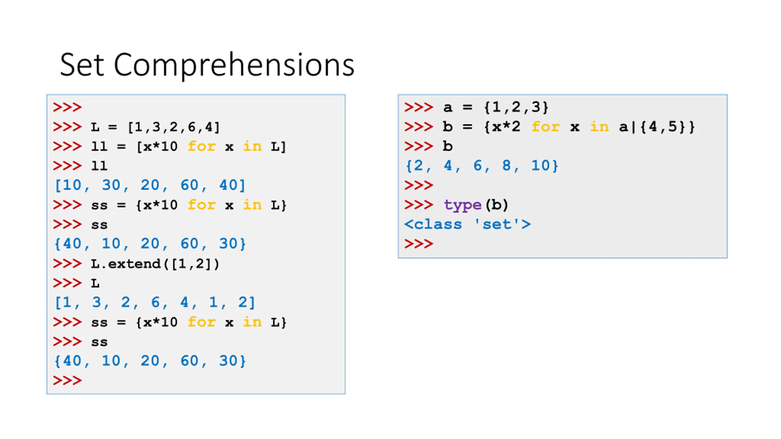 Set Comprehensions >>> >>> L = [1,3,2,6,4] >>> ll = [x*10 for x in L] >>> ll [10, 30, 20, 60, 40] >>> ss = {x*10 for x in L} >>> ss {40, 10, 20, 60, 30} >>> L.extend([1,2]) >>> L [1, 3, 2, 6, 4, 1, 2] >>> ss = {x*10 for x in L} >>> ss {40, 10, 20, 60, 30} >>> >>> a = {1,2,3} >>> b = {x*2 for x in a|{4,5}} >>> b {2, 4, 6, 8, 10} >>> >>> type(b) <class 'set'> >>>