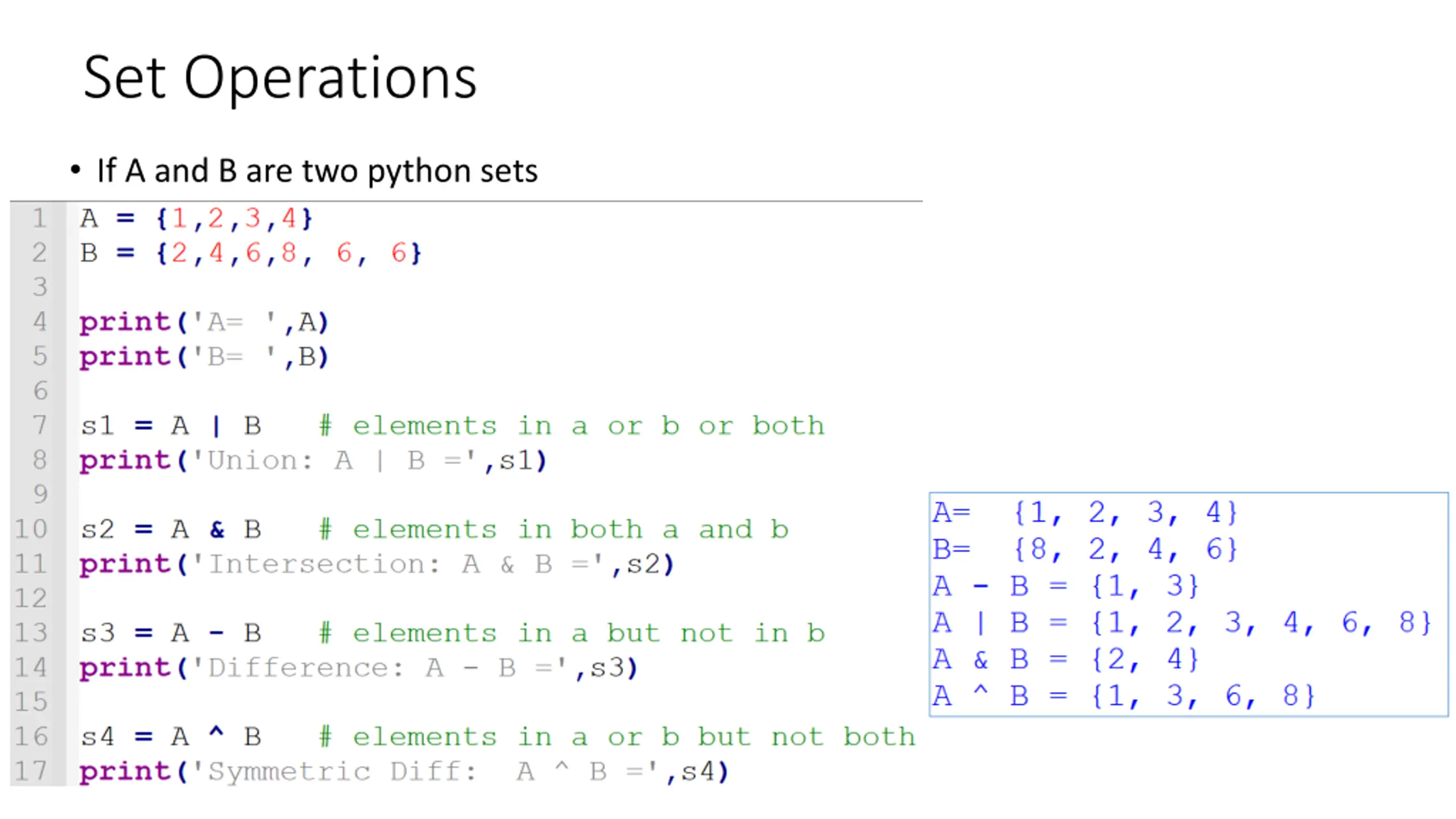 Set Operations If A and B are two python sets A = {1,2,3,4} B = {2,4,6,8, 6, 6} print('A= ',A) print('B= ',B) s1 = A | B # elements in a or b or both print( Union: A | B =',s1) s2 = A & B # elements in both a and b print( Intersection: A & B =',s2) s3 = A - B # elements in a but not in b print( Difference: A - B =',s3) s4 = A ^ B # elements in a or b but not both print( Symmetric Diff: A ^ B =',s4)