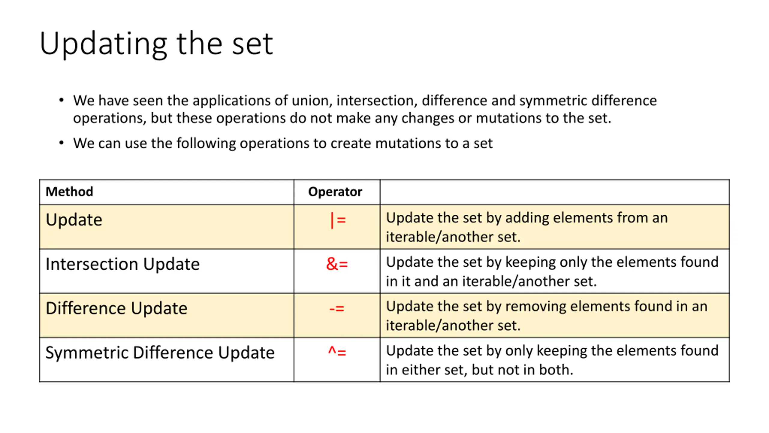 Updating the set We have seen the applications of union, intersection, difference and symmetric difference operations, but these operations do not make any changes or mutations to the set. We can use the following operations to create mutations to a set Method Operator Update the set by adding elements from an iterable/another set. Update |= Update the set by keeping only the elements found in it and an iterable/another set. Intersection Update &= Update the set by removing elements found in an iterable/another set. Difference Update -= Update the set by only keeping the elements found in either set, but not in both. Symmetric Difference Update ^=