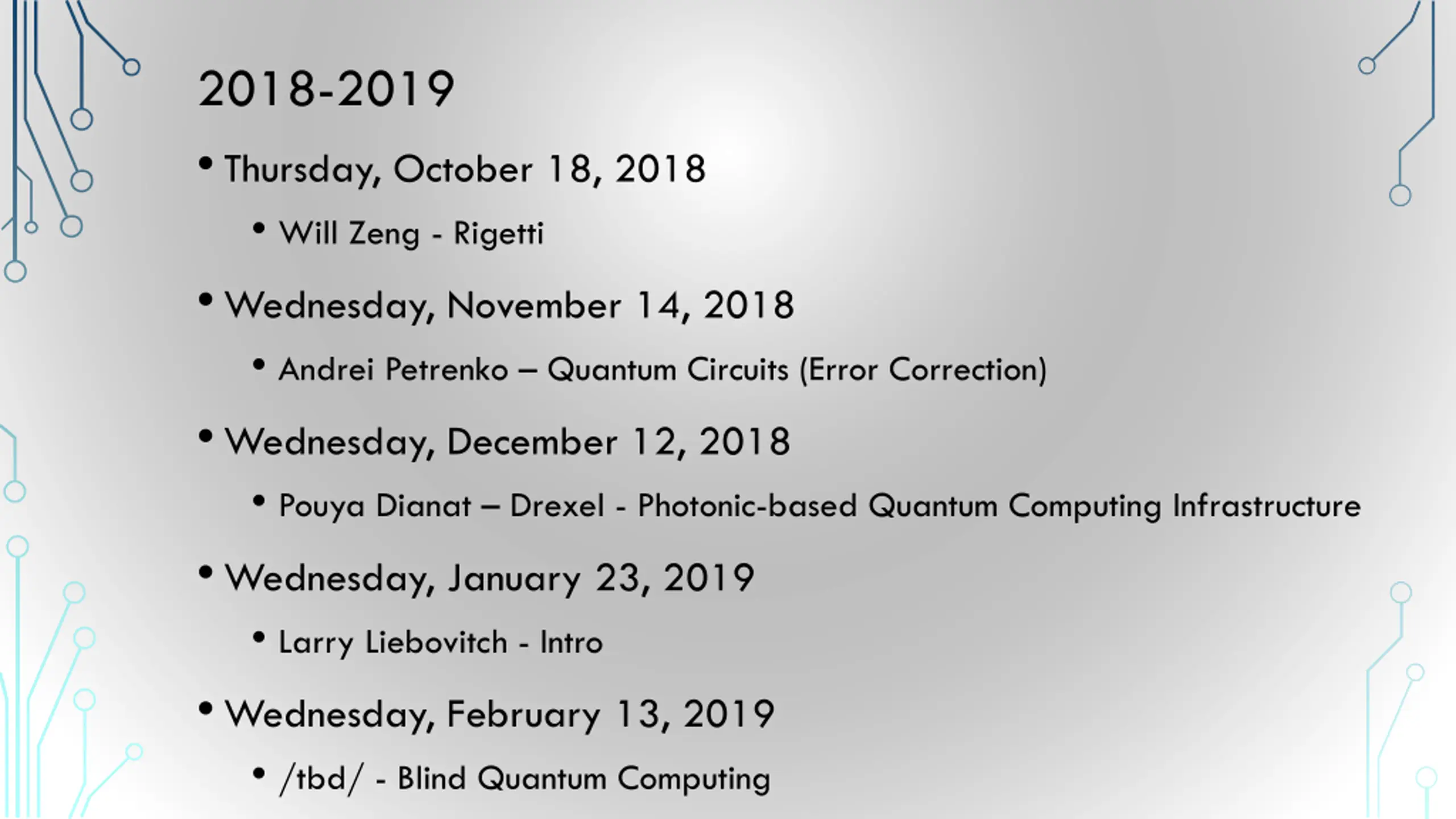 2018-2019 Thursday, October 18, 2018 Will Zeng - Rigetti Wednesday, November 14, 2018 Andrei Petrenko Quantum Circuits (Error Correction) Wednesday, December 12, 2018 Pouya Dianat Drexel - Photonic-based Quantum Computing Infrastructure Wednesday, January 23, 2019 Larry Liebovitch - Intro Wednesday, February 13, 2019 /tbd/ - Blind Quantum Computing