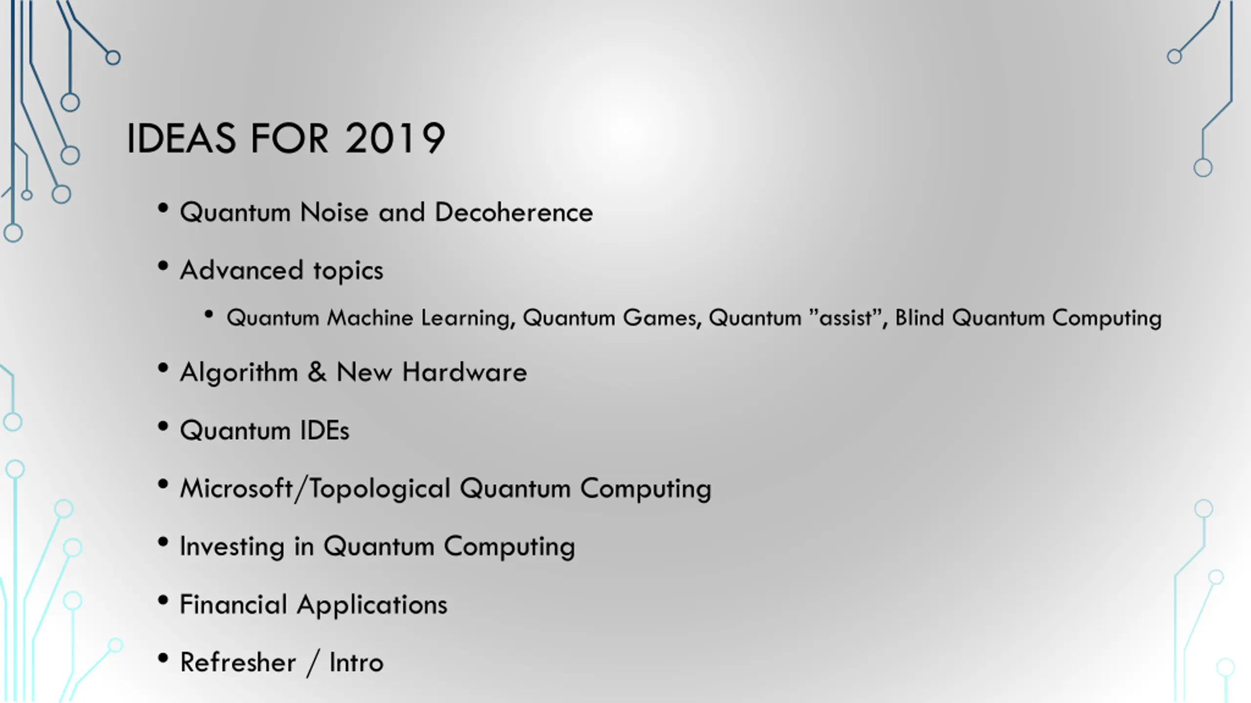 IDEAS FOR 2019 Quantum Noise and Decoherence Advanced topics Quantum Machine Learning, Quantum Games, Quantum assist , Blind Quantum Computing Algorithm & New Hardware Quantum IDEs Microsoft/Topological Quantum Computing Investing in Quantum Computing Financial Applications Refresher / Intro