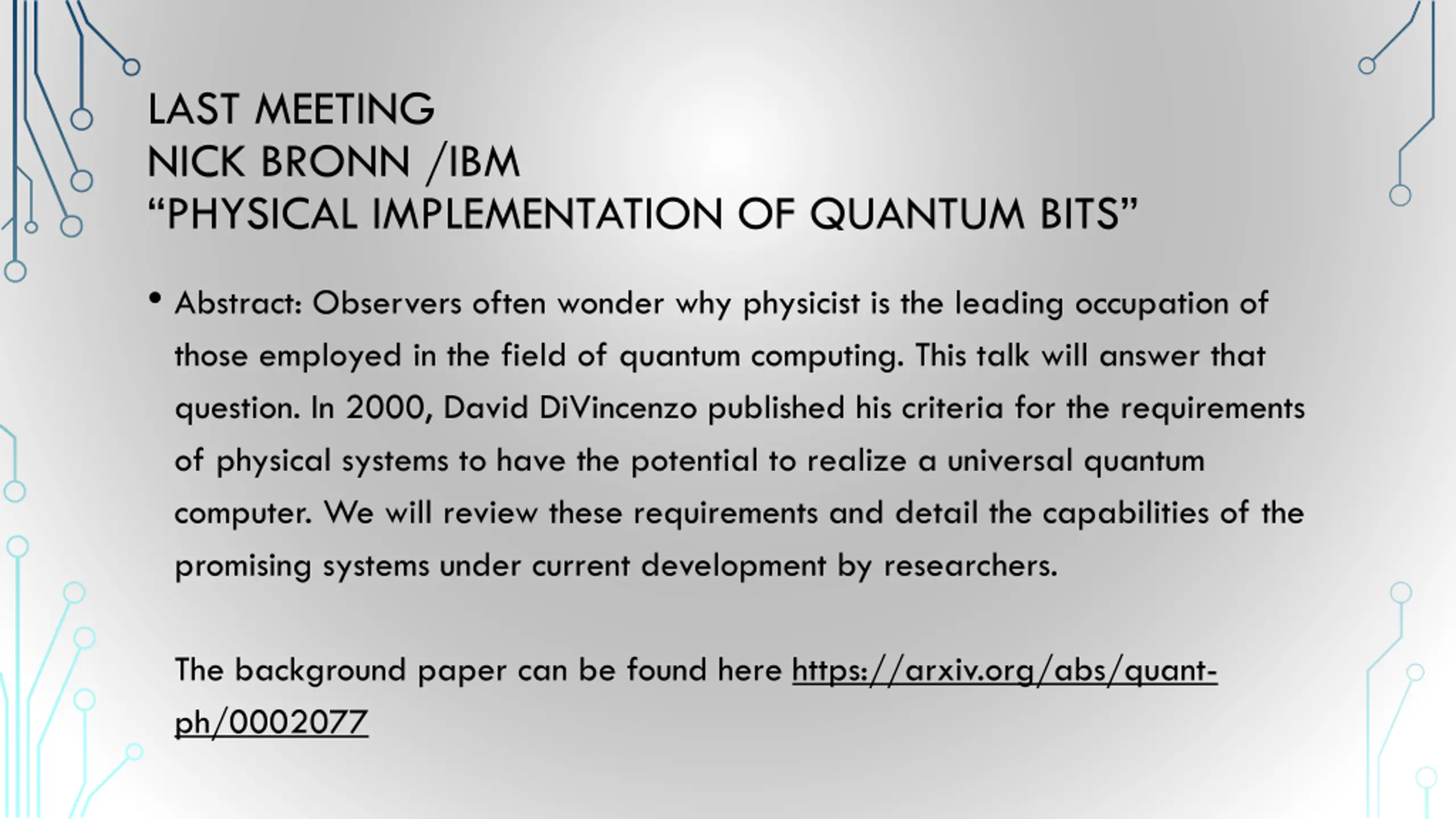 LAST MEETING NICK BRONN /IBM PHYSICAL IMPLEMENTATION OF QUANTUM BITS Abstract: Observers often wonder why physicist is the leading occupation of those employed in the field of quantum computing. This talk will answer that question. In 2000, David DiVincenzo published his criteria for the requirements of physical systems to have the potential to realize a universal quantum computer. We will review these requirements and detail the capabilities of the promising systems under current development by researchers. The background paper can be found here https://arxiv.org/abs/quant- ph/0002077