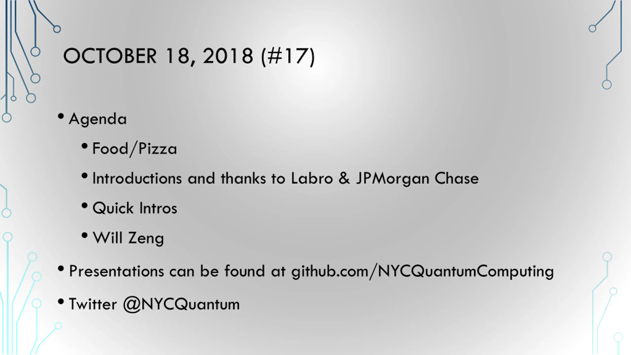 OCTOBER 18, 2018 (#17) Agenda Food/Pizza Introductions and thanks to Labro & JPMorgan Chase Quick Intros Will Zeng Presentations can be found at github.com/NYCQuantumComputing Twitter @NYCQuantum