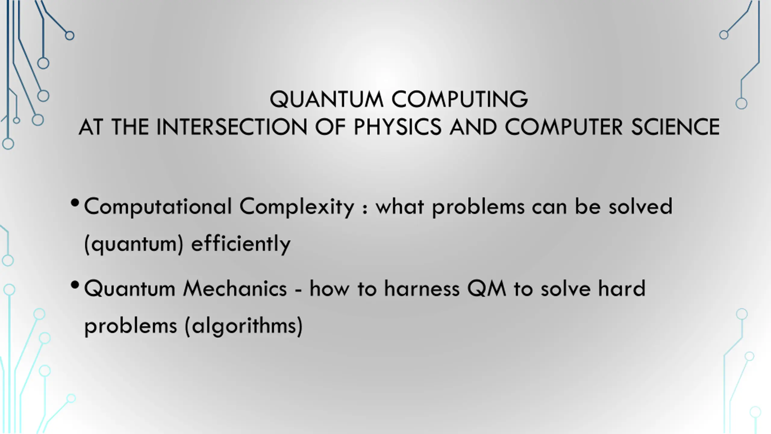 QUANTUM COMPUTING AT THE INTERSECTION OF PHYSICS AND COMPUTER SCIENCE Computational Complexity : what problems can be solved (quantum) efficiently Quantum Mechanics - how to harness QM to solve hard problems (algorithms)