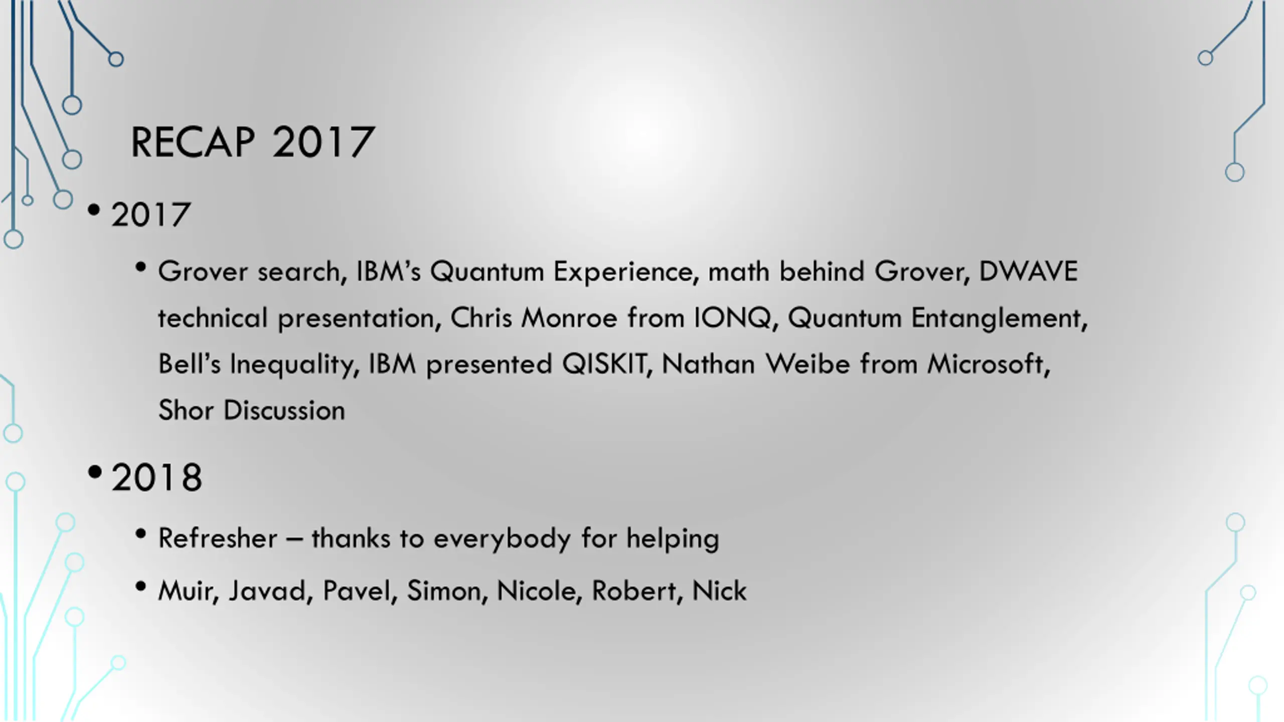 RECAP 2017 2017 Grover search, IBM s Quantum Experience, math behind Grover, DWAVE technical presentation, Chris Monroe from IONQ, Quantum Entanglement, Bell s Inequality, IBM presented QISKIT, Nathan Weibe from Microsoft, Shor Discussion 2018 Refresher thanks to everybody for helping Muir, Javad, Pavel, Simon, Nicole, Robert, Nick