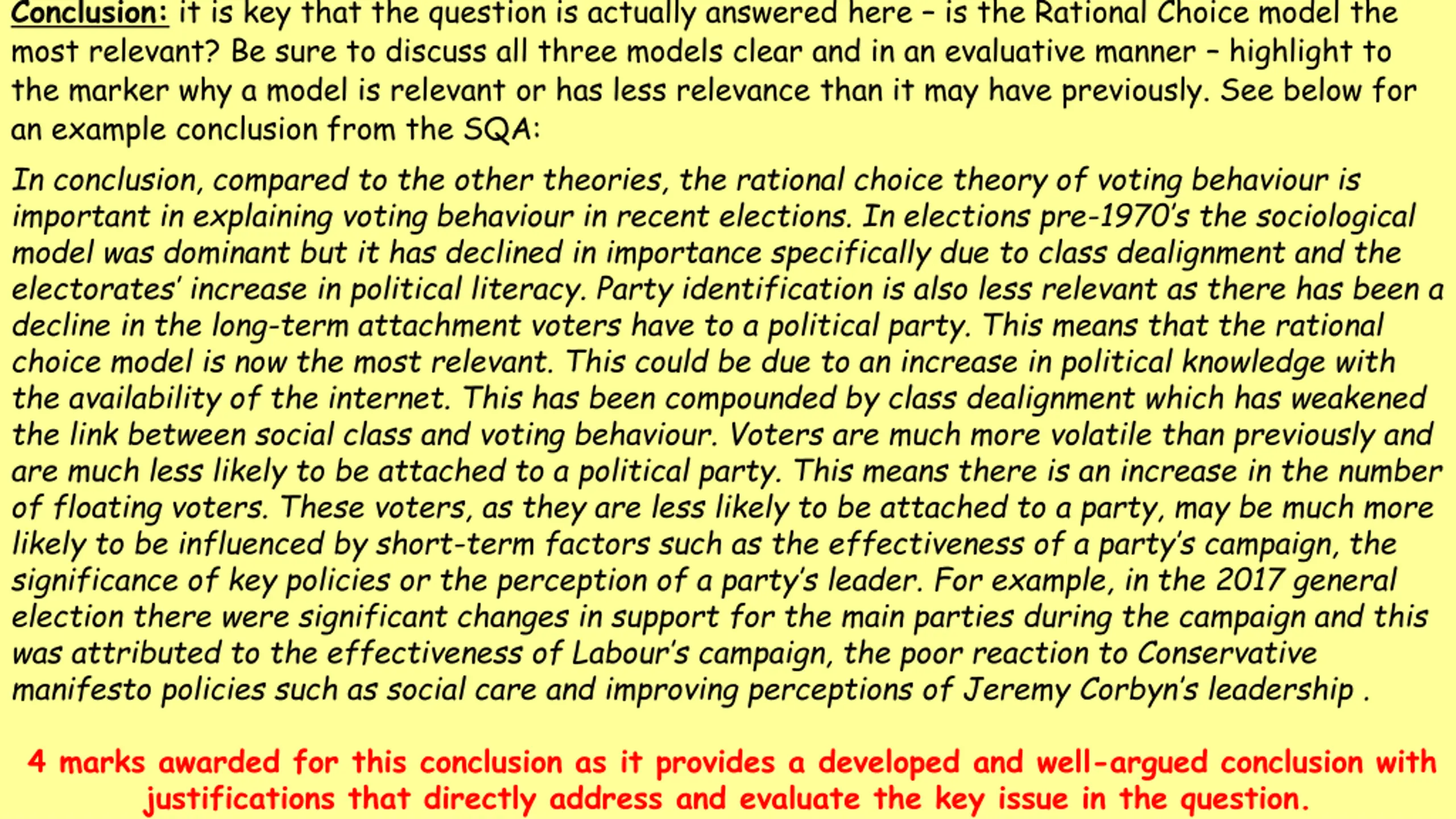Conclusion: it is key that the question is actually answered here is the Rational Choice model the most relevant? Be sure to discuss all three models clear and in an evaluative manner highlight to the marker why a model is relevant or has less relevance than it may have previously. See below for an example conclusion from the SQA: In conclusion, compared to the other theories, the rational choice theory of voting behaviour is important in explaining voting behaviour in recent elections. In elections pre-1970 s the sociological model was dominant but it has declined in importance specifically due to class dealignment and the electorates increase in political literacy. Party identification is also less relevant as there has been a decline in the long-term attachment voters have to a political party. This means that the rational choice model is now the most relevant. This could be due to an increase in political knowledge with the availability of the internet. This has been compounded by class dealignment which has weakened the link between social class and voting behaviour. Voters are much more volatile than previously and are much less likely to be attached to a political party. This means there is an increase in the number of floating voters. These voters, as they are less likely to be attached to a party, may be much more likely to be influenced by short-term factors such as the effectiveness of a party s campaign, the significance of key policies or the perception of a party s leader. For example, in the 2017 general election there were significant changes in support for the main parties during the campaign and this was attributed to the effectiveness of Labour s campaign, the poor reaction to Conservative manifesto policies such as social care and improving perceptions of Jeremy Corbyn s leadership . 4 marks awarded for this conclusion as it provides a developed and well-argued conclusion with justifications that directly address and evaluate the key issue in the question.