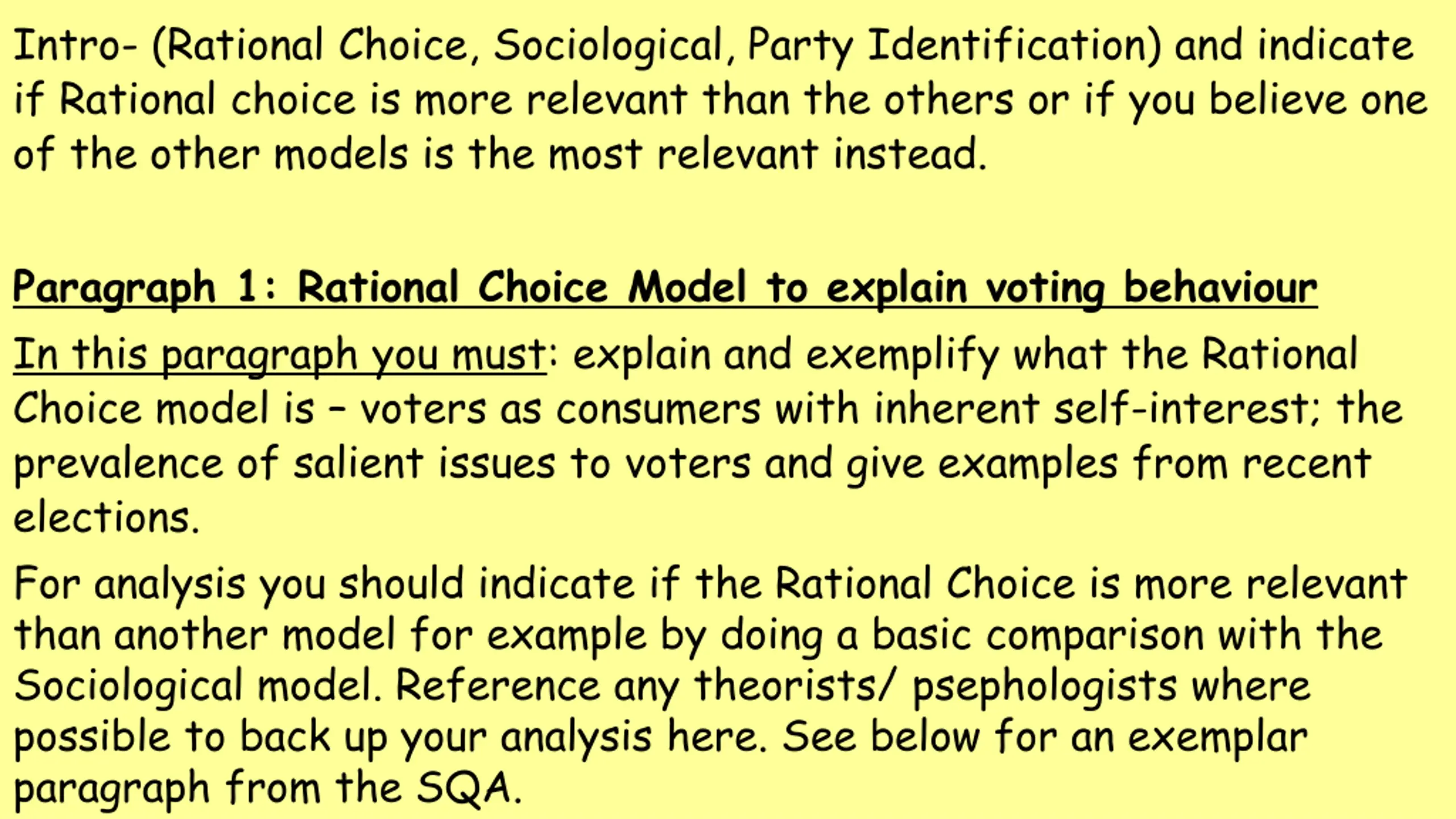 Intro- (Rational Choice, Sociological, Party Identification) and indicate if Rational choice is more relevant than the others or if you believe one of the other models is the most relevant instead. Paragraph 1: Rational Choice Model to explain voting behaviour In this paragraph you must: explain and exemplify what the Rational Choice model is voters as consumers with inherent self-interest; the prevalence of salient issues to voters and give examples from recent elections. For analysis you should indicate if the Rational Choice is more relevant than another model for example by doing a basic comparison with the Sociological model. Reference any theorists/ psephologists where possible to back up your analysis here. See below for an exemplar paragraph from the SQA.