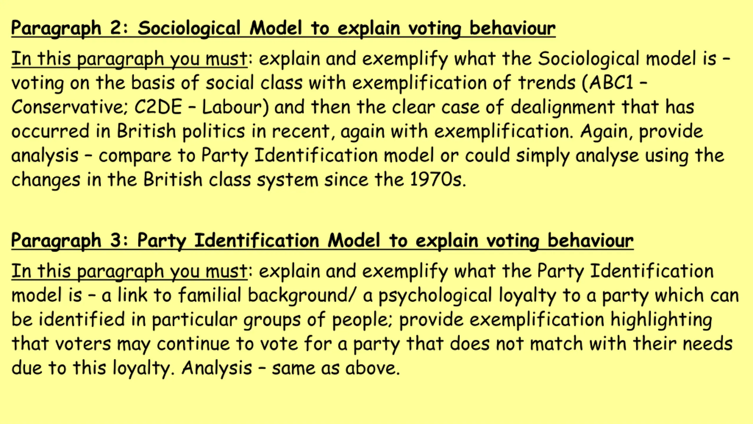 Paragraph 2: Sociological Model to explain voting behaviour In this paragraph you must: explain and exemplify what the Sociological model is voting on the basis of social class with exemplification of trends (ABC1 Conservative; C2DE Labour) and then the clear case of dealignment that has occurred in British politics in recent, again with exemplification. Again, provide analysis compare to Party Identification model or could simply analyse using the changes in the British class system since the 1970s. Paragraph 3: Party Identification Model to explain voting behaviour In this paragraph you must: explain and exemplify what the Party Identification model is a link to familial background/ a psychological loyalty to a party which can be identified in particular groups of people; provide exemplification highlighting that voters may continue to vote for a party that does not match with their needs due to this loyalty. Analysis same as above.