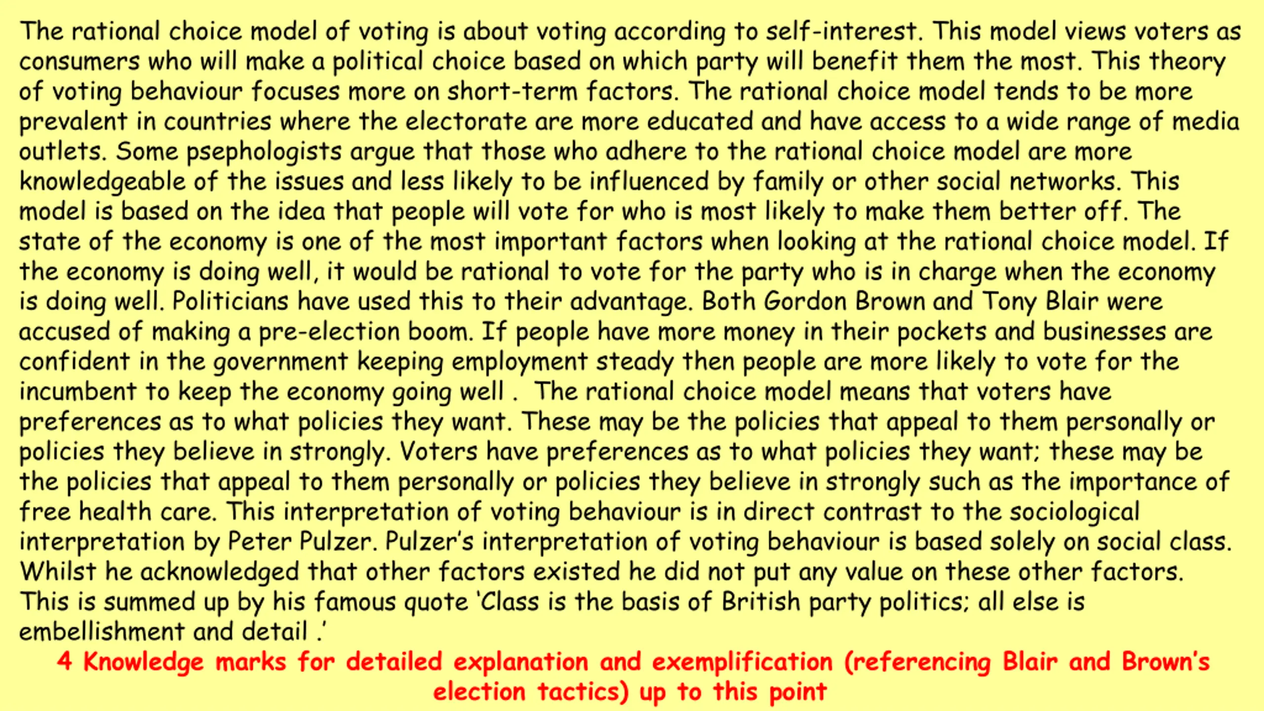 The rational choice model of voting is about voting according to self-interest. This model views voters as consumers who will make a political choice based on which party will benefit them the most. This theory of voting behaviour focuses more on short-term factors. The rational choice model tends to be more prevalent in countries where the electorate are more educated and have access to a wide range of media outlets. Some psephologists argue that those who adhere to the rational choice model are more knowledgeable of the issues and less likely to be influenced by family or other social networks. This model is based on the idea that people will vote for who is most likely to make them better off. The state of the economy is one of the most important factors when looking at the rational choice model. If the economy is doing well, it would be rational to vote for the party who is in charge when the economy is doing well. Politicians have used this to their advantage. Both Gordon Brown and Tony Blair were accused of making a pre-election boom. If people have more money in their pockets and businesses are confident in the government keeping employment steady then people are more likely to vote for the incumbent to keep the economy going well .The rational choice model means that voters have preferences as to what policies they want. These may be the policies that appeal to them personally or policies they believe in strongly. Voters have preferences as to what policies they want; these may be the policies that appeal to them personally or policies they believe in strongly such as the importance of free health care. This interpretation of voting behaviour is in direct contrast to the sociological interpretation by Peter Pulzer. Pulzer s interpretation of voting behaviour is based solely on social class. Whilst he acknowledged that other factors existed he did not put any value on these other factors. This is summed up by his famous quote Class is the basis of British party politics; all else is embellishment and detail . 4 Knowledge marks for detailed explanation and exemplification (referencing Blair and Brown s election tactics) up to this point