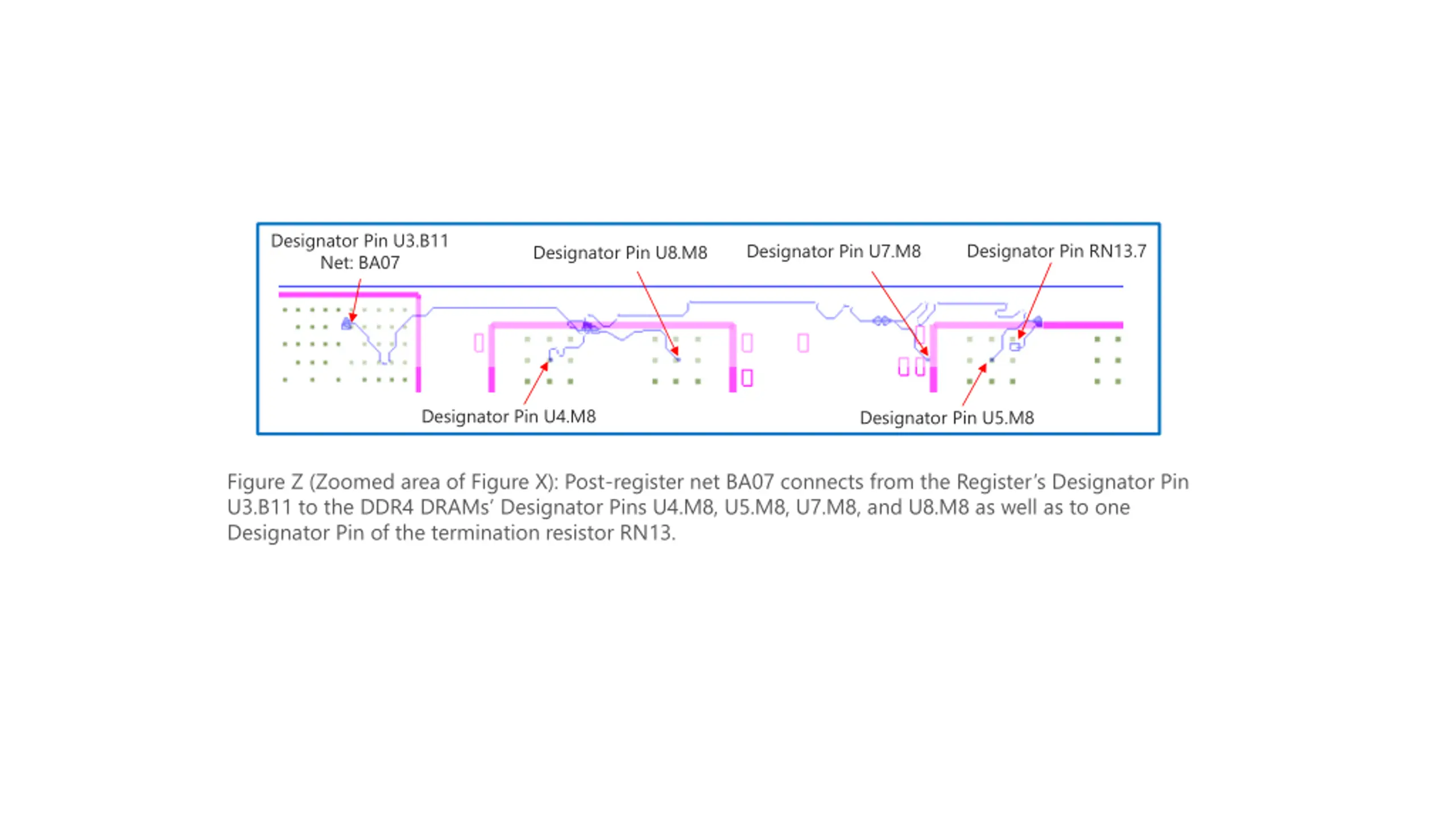 Designator Pin U3.B11 Net: BA07 Designator Pin RN13.7 Designator Pin U7.M8 Designator Pin U8.M8 Designator Pin U4.M8 Designator Pin U5.M8 Figure Z (Zoomed area of Figure X): Post-register net BA07 connects from the Register s Designator Pin U3.B11 to the DDR4 DRAMs Designator Pins U4.M8, U5.M8, U7.M8, and U8.M8 as well as to one Designator Pin of the termination resistor RN13.