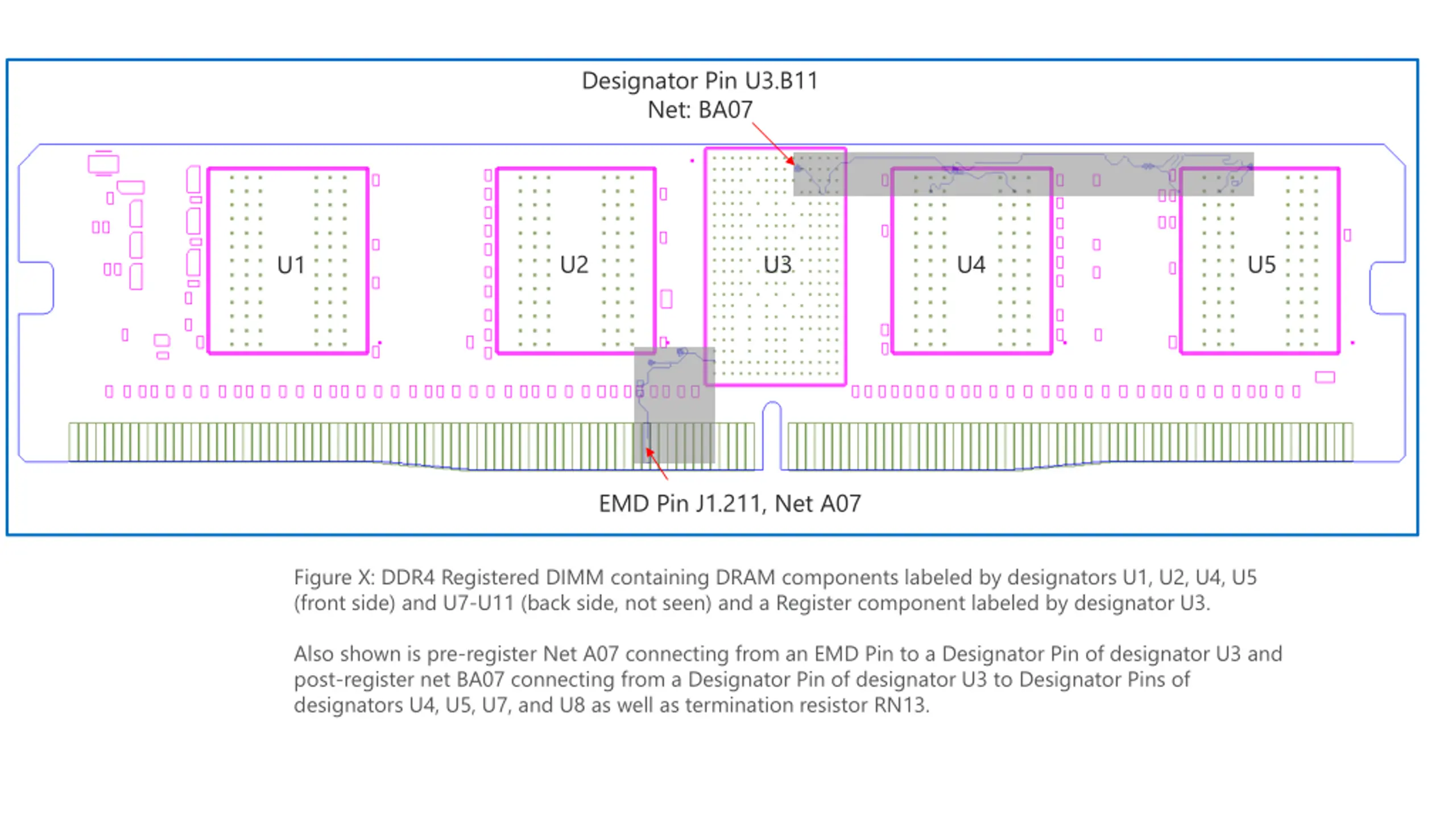 Designator Pin U3.B11 Net: BA07 U3 U4 U5 U2 U1 EMD Pin J1.211, Net A07 Figure X: DDR4 Registered DIMM containing DRAM components labeled by designators U1, U2, U4, U5 (front side) and U7-U11 (back side, not seen) and a Register component labeled by designator U3. Also shown is pre-register Net A07 connecting from an EMD Pin to a Designator Pin of designator U3 and post-register net BA07 connecting from a Designator Pin of designator U3 to Designator Pins of designators U4, U5, U7, and U8 as well as termination resistor RN13.