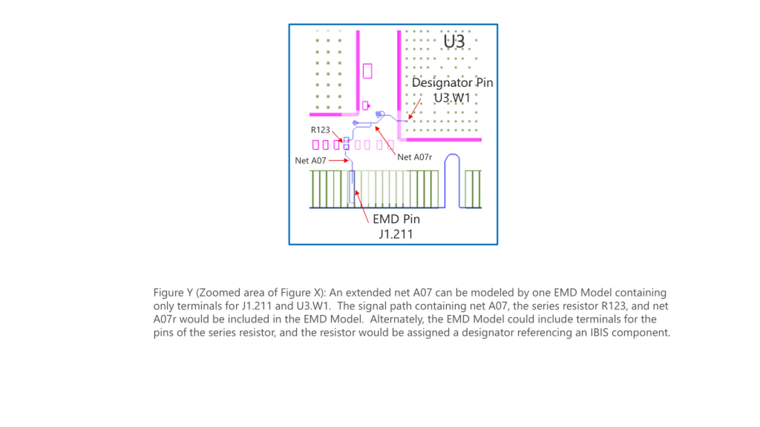 Designator Pin U3.W1 R123 Net A07r Net A07 EMD Pin J1.211 Figure Y (Zoomed area of Figure X): An extended net A07 can be modeled by one EMD Model containing only terminals for J1.211 and U3.W1. The signal path containing net A07, the series resistor R123, and net A07r would be included in the EMD Model. Alternately, the EMD Model could include terminals for the pins of the series resistor, and the resistor would be assigned a designator referencing an IBIS component.