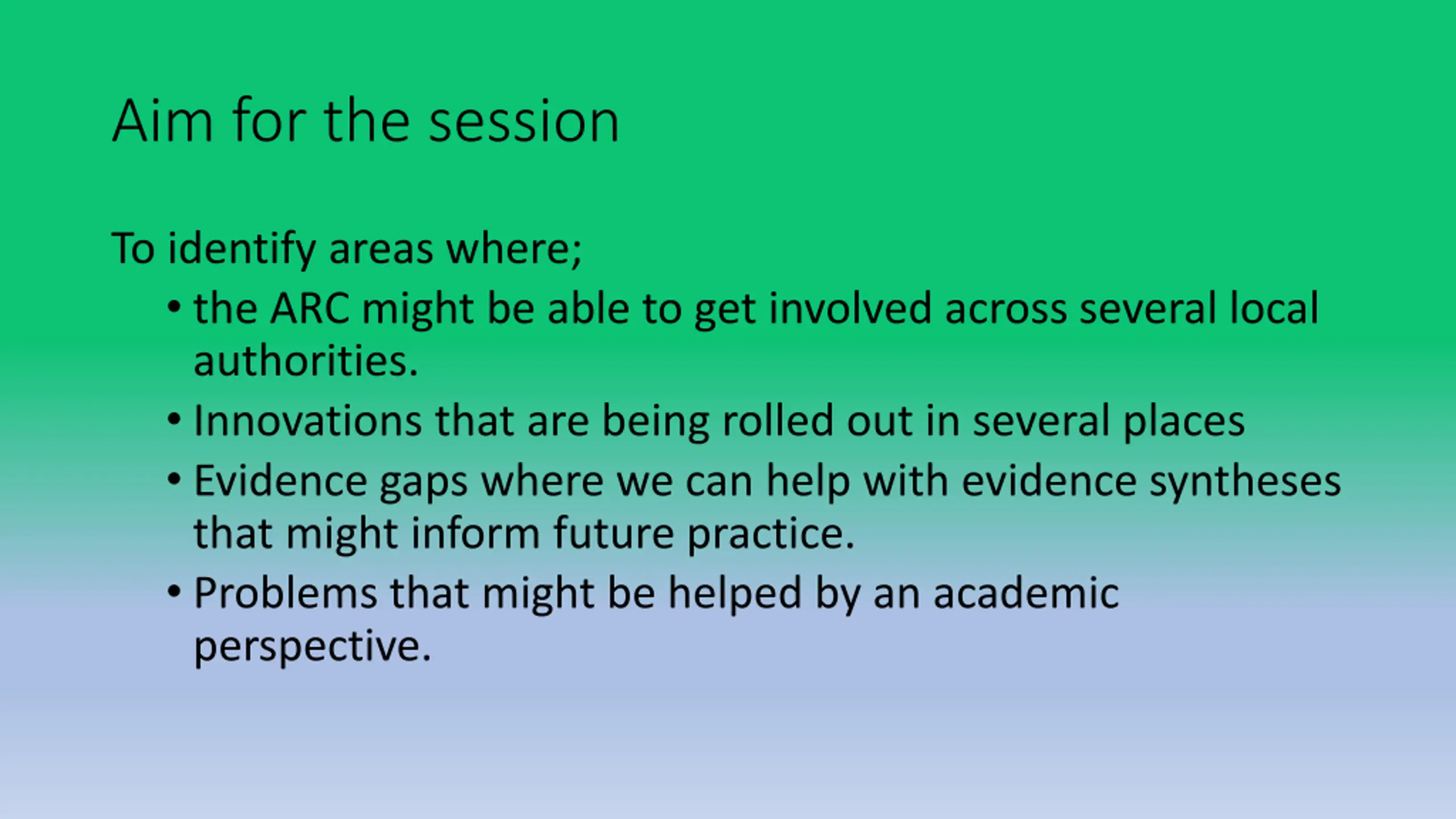 Aim for the session To identify areas where; the ARC might be able to get involved across several local authorities. Innovations that are being rolled out in several places Evidence gaps where we can help with evidence syntheses that might inform future practice. Problems that might be helped by an academic perspective.