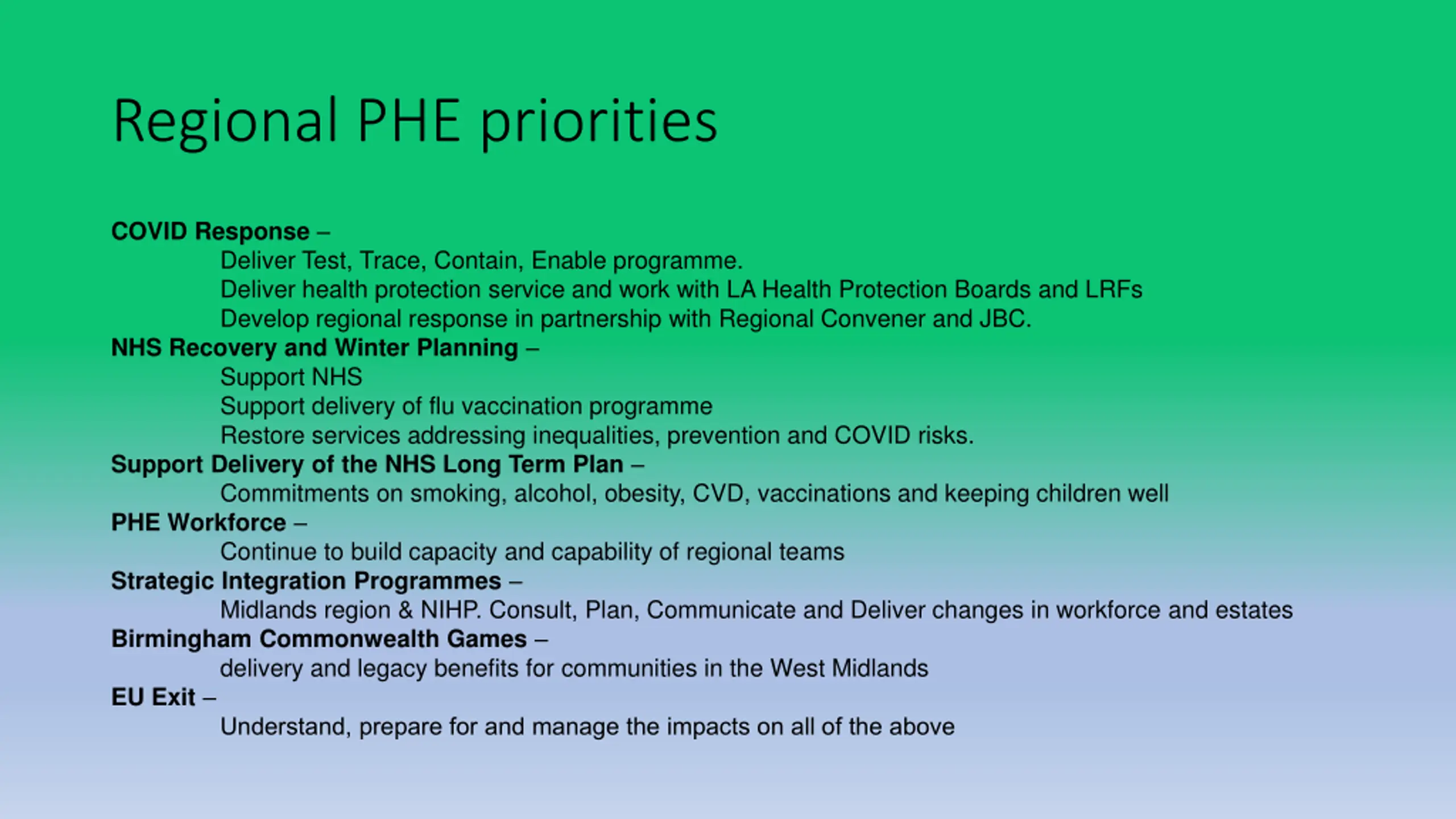 Regional PHE priorities COVID Response Deliver Test, Trace, Contain, Enable programme. Deliver health protection service and work with LA Health Protection Boards and LRFs Develop regional response in partnership with Regional Convener and JBC. NHS Recovery and Winter Planning Support NHS Support delivery of flu vaccination programme Restore services addressing inequalities, prevention and COVID risks. Support Delivery of the NHS Long Term Plan Commitments on smoking, alcohol, obesity, CVD, vaccinations and keeping children well PHE Workforce Continue to build capacity and capability of regional teams Strategic Integration Programmes Midlands region & NIHP. Consult, Plan, Communicate and Deliver changes in workforce and estates Birmingham Commonwealth Games delivery and legacy benefits for communities in the West Midlands EU Exit Understand, prepare for and manage the impacts on all of the above
