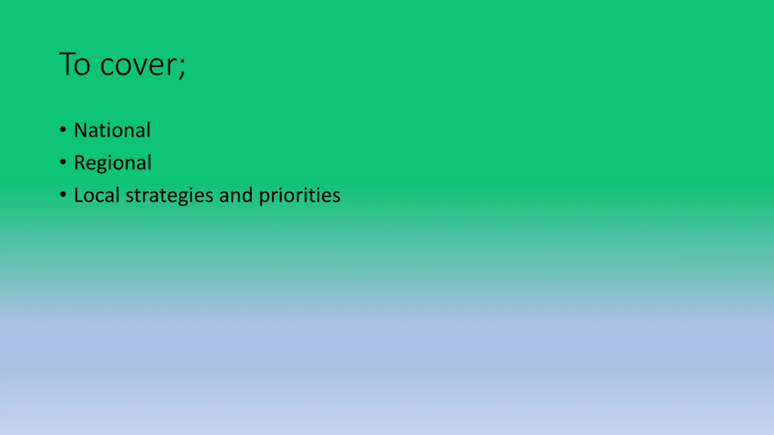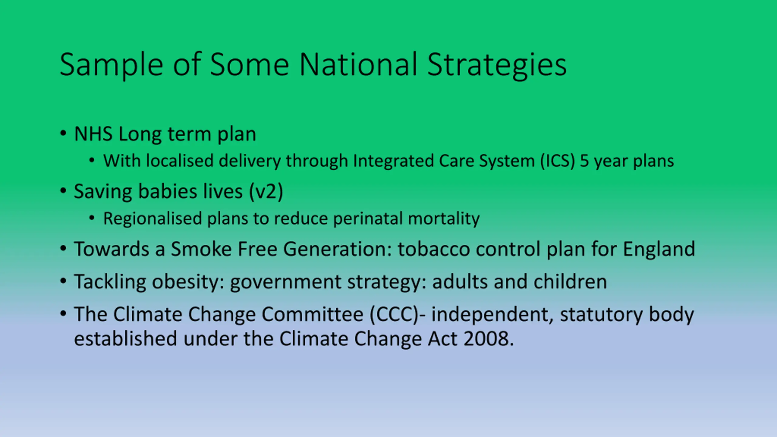 Sample of Some National Strategies NHS Long term plan With localised delivery through Integrated Care System (ICS) 5 year plans Saving babies lives (v2) Regionalised plans to reduce perinatal mortality Towards a Smoke Free Generation: tobacco control plan for England Tackling obesity: government strategy: adults and children The Climate Change Committee (CCC)- independent, statutory body established under the Climate Change Act 2008.
