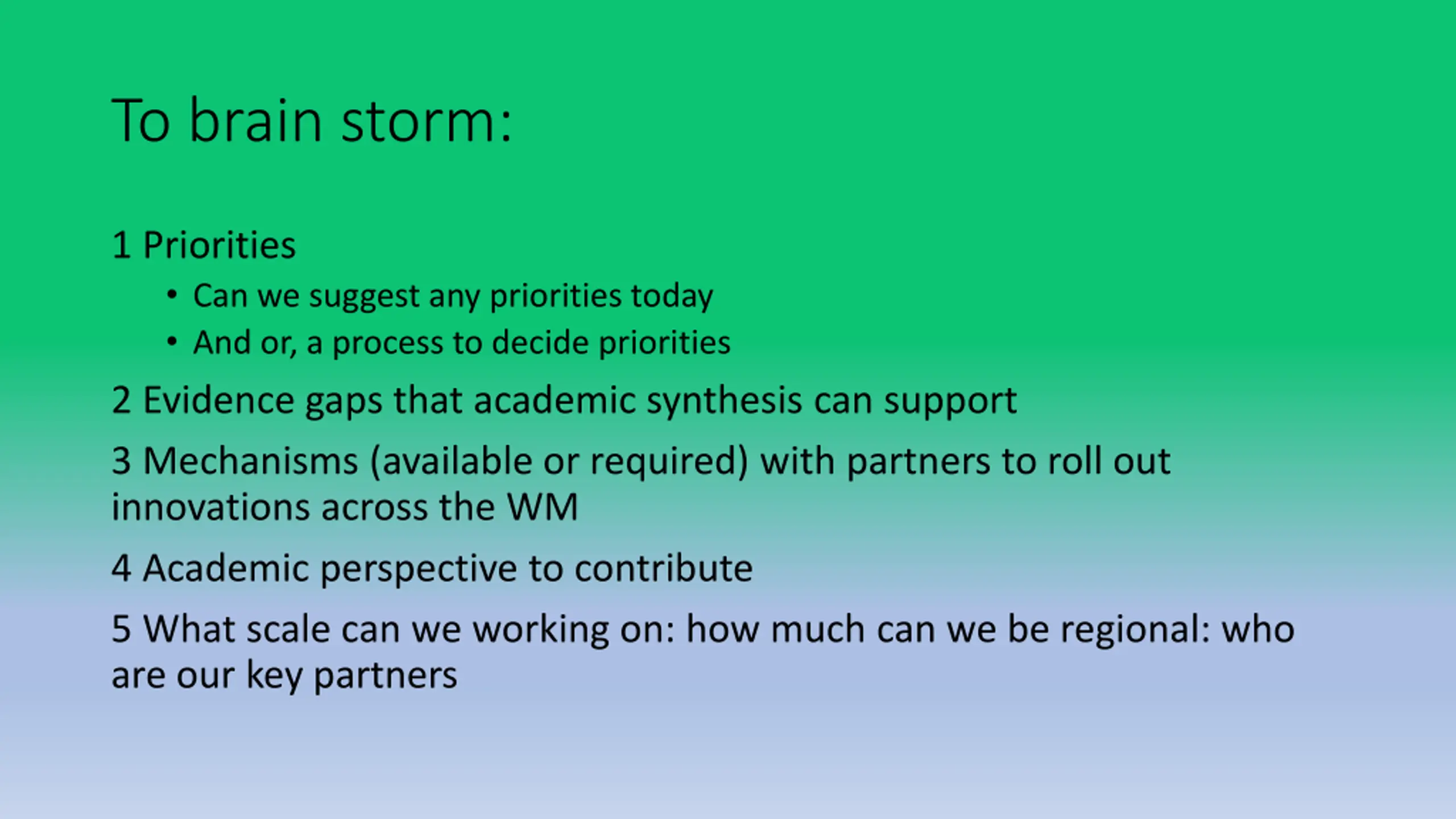To brain storm: 1 Priorities Can we suggest any priorities today And or, a process to decide priorities 2 Evidence gaps that academic synthesis can support 3 Mechanisms (available or required) with partners to roll out innovations across the WM 4 Academic perspective to contribute 5 What scale can we working on: how much can we be regional: who are our key partners