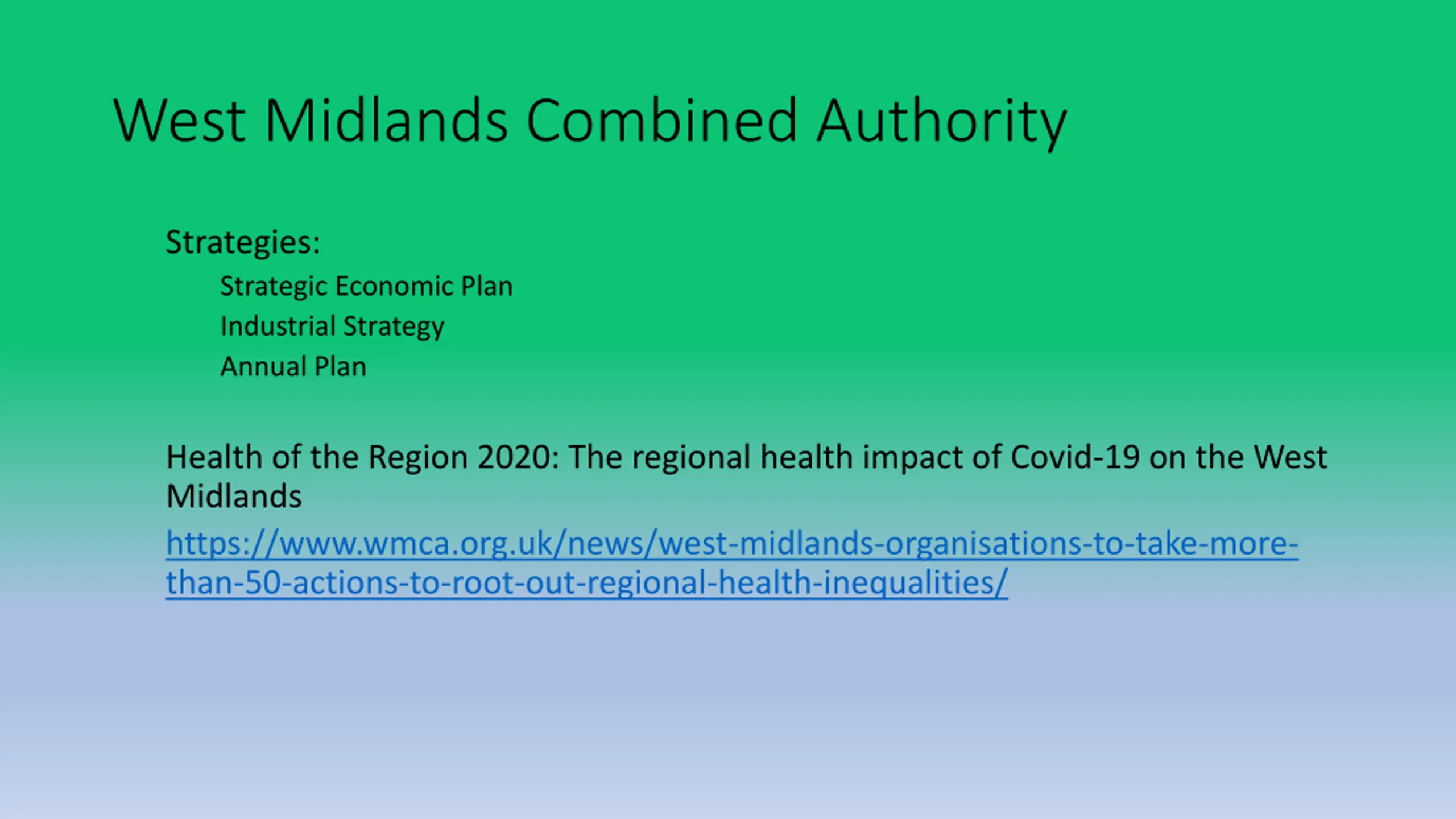 West Midlands Combined Authority Strategies: Strategic Economic Plan Industrial Strategy Annual Plan Health of the Region 2020: The regional health impact of Covid-19 on the West Midlands https://www.wmca.org.uk/news/west-midlands-organisations-to-take-more- than-50-actions-to-root-out-regional-health-inequalities/